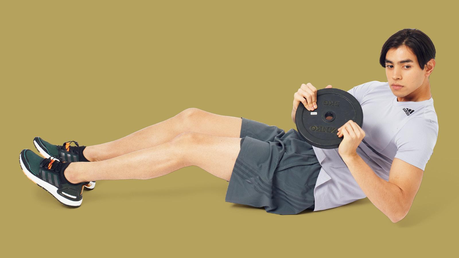 でも、このフェイズでドラゴンフラッグを加えたのは、マウンティングの道具にしてほしいからではない。ベンチを両手でホールドし、ブリッジしながら下半身を低く下ろす動きは、体幹のみならず、上腕外側の上腕三頭筋や背中の広背筋にも効く。つまり菱形体型をデザインするうえで、一石三鳥の種目。5回できたら上出来だ。