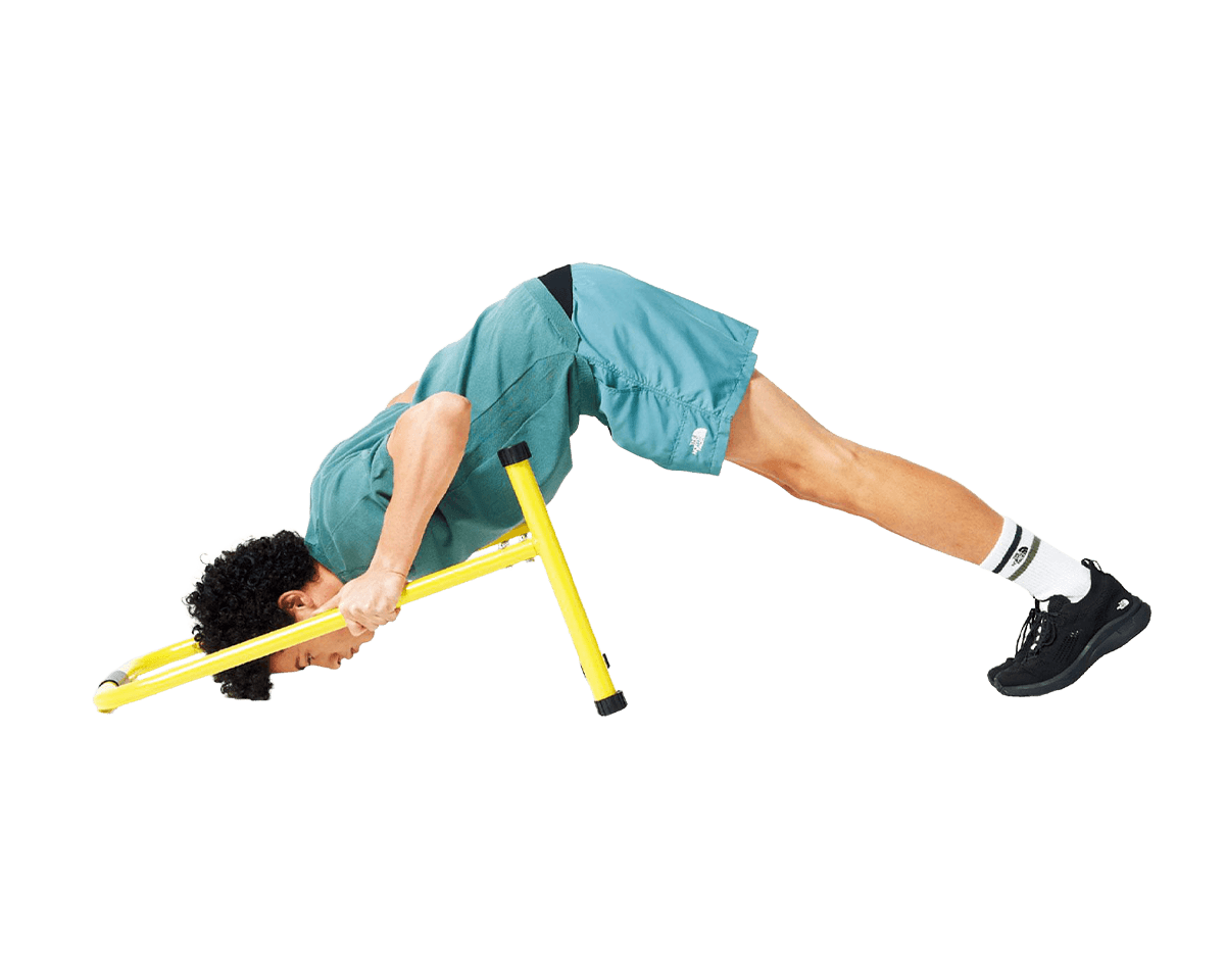 ディップスタンド2台を肩幅程度の間隔で平行に並べる。その間に立ってバーを握り、両腕を伸ばして全身を持ち上げ、膝を曲げて両脚をクロスさせる。