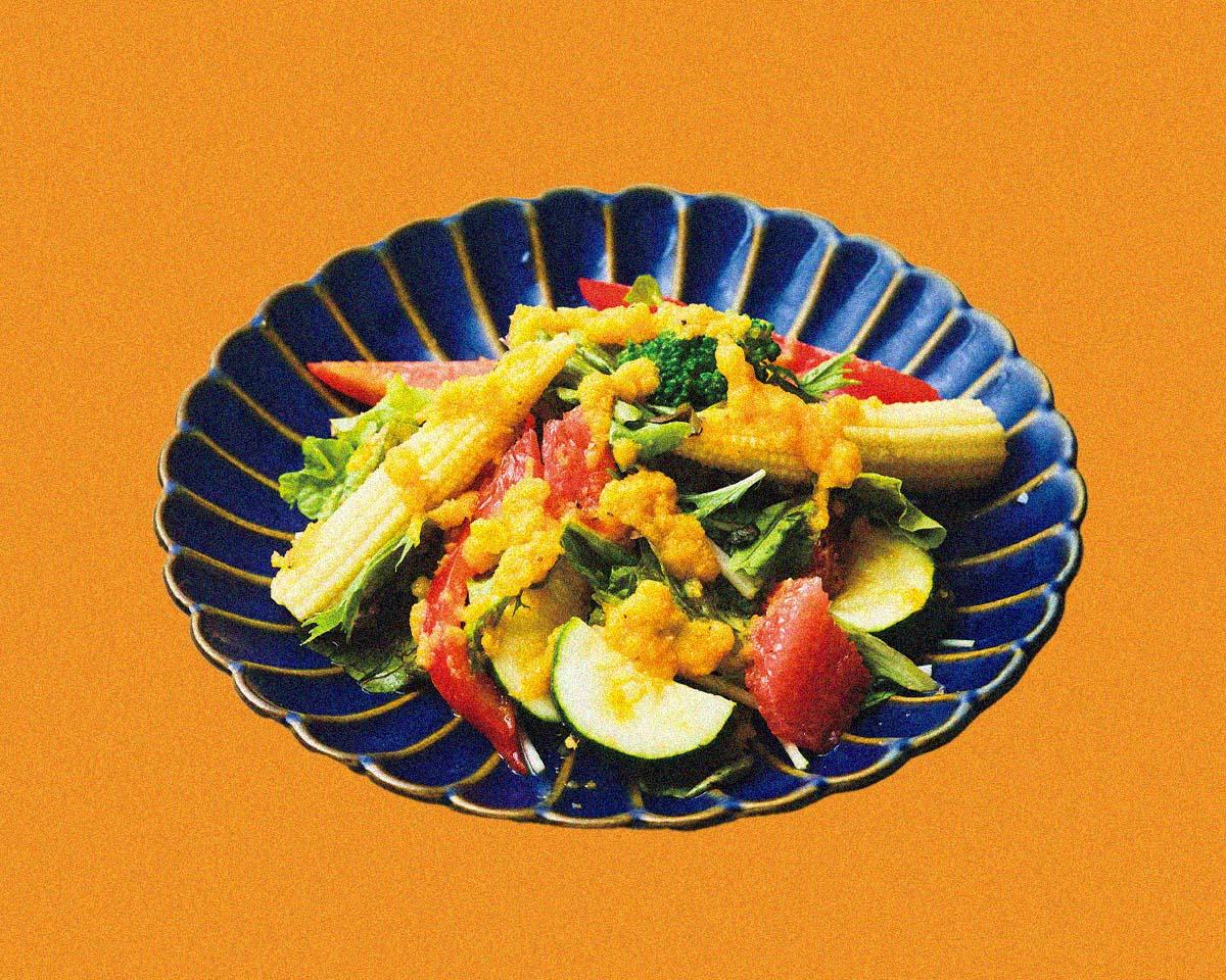柔道家として活躍していた〈ひらちゃん〉の平田侑城さんに教えていただく減量時もうれしいレシピ。ニンジンに玉ネギ、塩麴、リンゴ酢、黒コショウを加えてなめらかに攪拌したサラダのドレッシングは、店で評判の味をアレンジ。