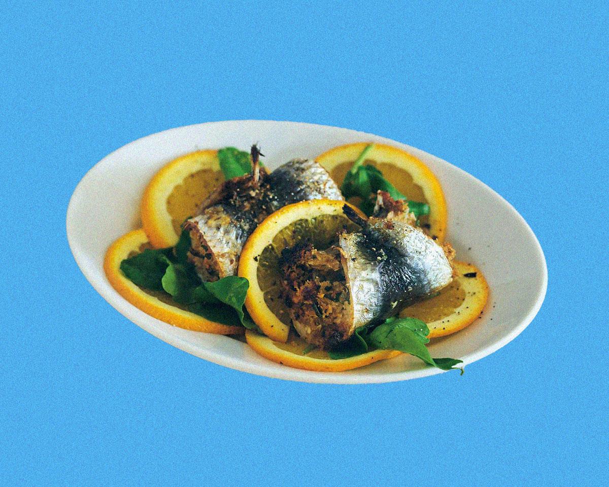 旬の脂が乗ったイワシに炒ったパン粉、レーズン、ナッツなどの詰め物をして焼いたベッカフィーコは、シチリアの郷土料理。「本来は前菜ですが、通常の倍くらいの詰め物をして豪快に」。
