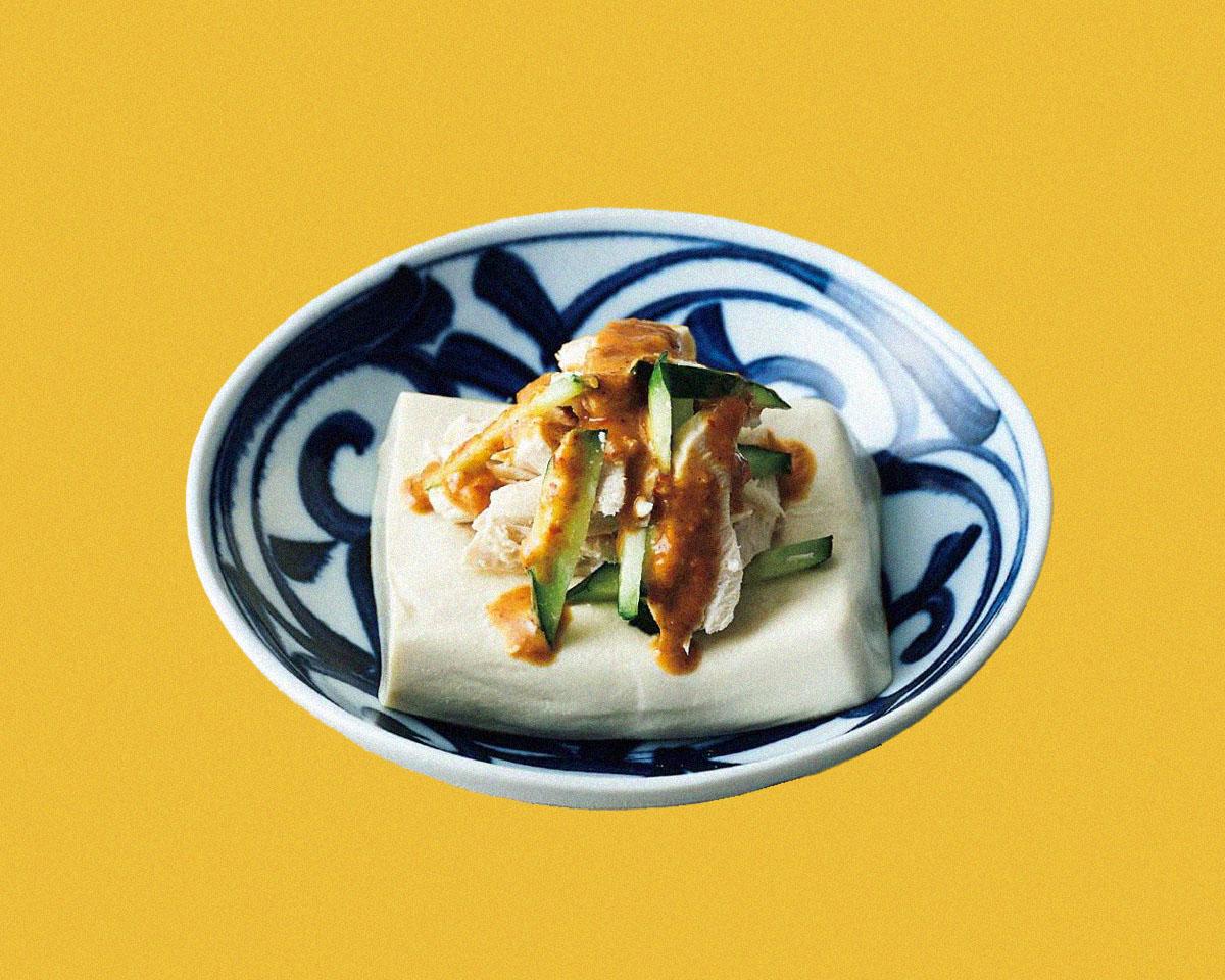 自身もトレーニングを行う“鍛えるシェフ”直伝の料理を紹介する「美味い筋肉レシピ」シリーズ。今回は〈TANIARASHI 六本木店〉店主の山口俊さんに教えてもらった「豆腐チーズ バンバンジー乗せ」。