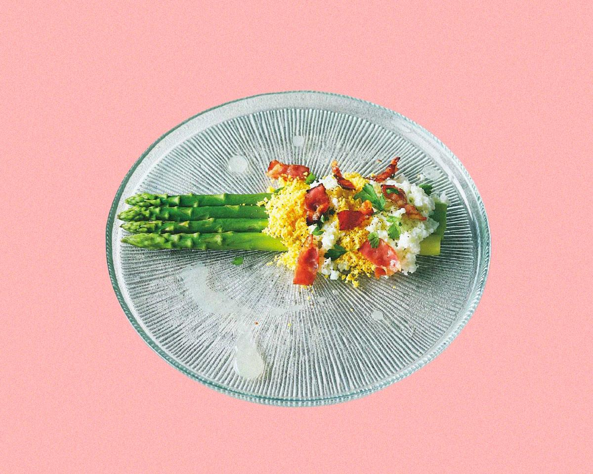 濾した茹で卵をミモザの花のように散らし、サッとレモン風味のドレッシングをかけたアスパラガスは、「瑞々しさを楽しんでください。一緒に乗せたカリカリベーコンもいい味のアクセントに」。