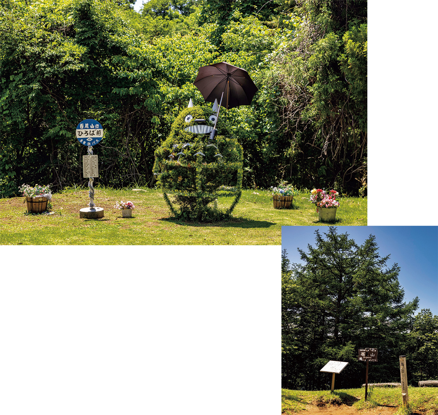左/百蔵山を下りたところにトトロの広場、そして東電鉄「ひろば前」というバス停。バス会社もバス停もまったくのウソですよ。 右/扇山山頂1138m、秀麗富嶽十二景のうちの六番だそうです。