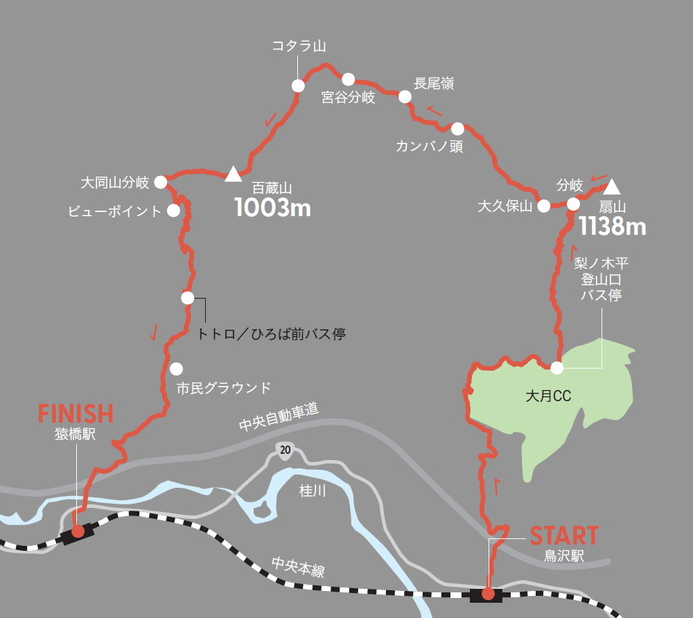 鳥沢駅から扇山、百蔵山へ、そして猿橋駅へと反時計まわりで巡る13㎞です。このふたつは秀麗富嶽十二景、晴天間違いなしの日を選んでお出かけください。標高差累積は1070m、また猿橋駅までの下り舗装路区間がおよそ3㎞です。鳥沢駅前から扇山登山口の梨ノ木平へのバス便(富士急)、運行日時など必ずご確認ください。