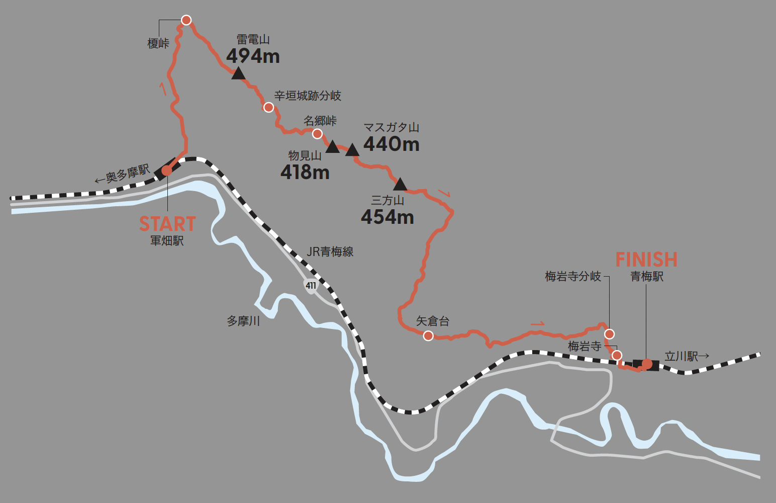 軍畑駅から榎峠までは交通量の多い都道193号、歩道のないところもあります、ご注意ください。最初の雷電山までは上りですが、そこからはアップダウンはあるものの下りベース、青梅の梅岩寺まで千変万化の路面を楽しめます。駅から駅へ、全行程10.6km。