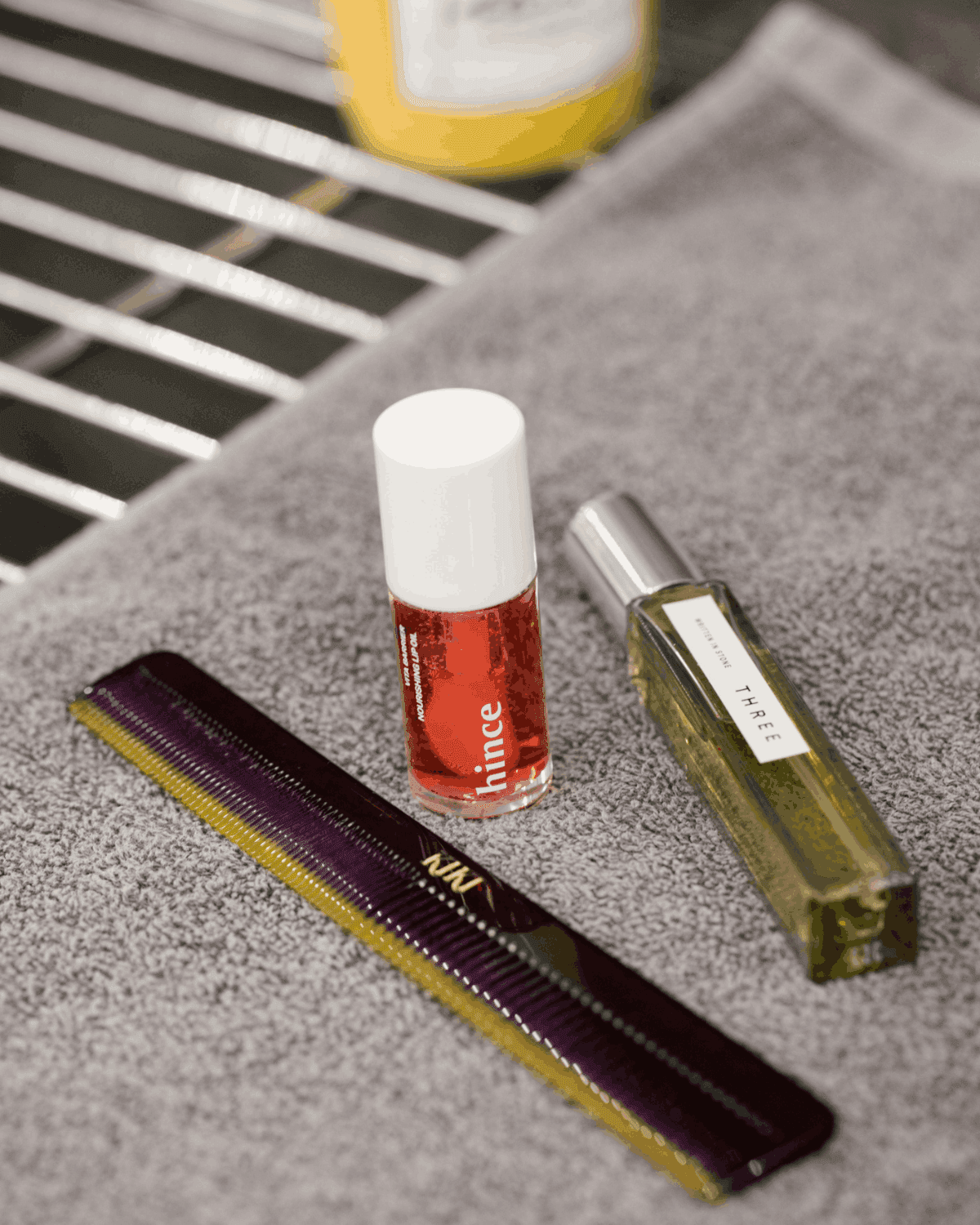 そして「運動の前後は必ずこれ」と手放せないフレグランス、〈スリー〉の「エッセンシャルセンツ 00」を纏ったら帰宅の準備が完了。