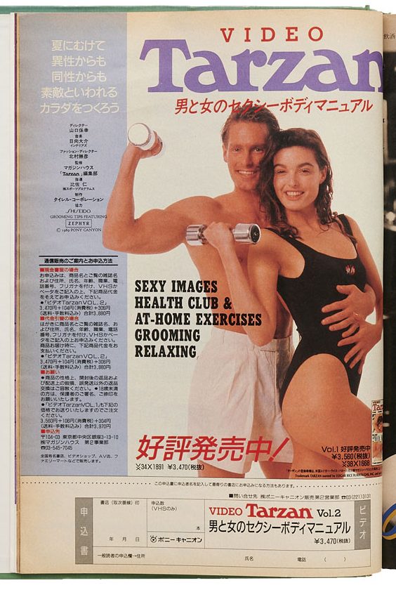 当時、『Tarzan』編集長だった石川次郎さんとお会いしたところ、開口一番「キミ、『Tarzan』を読んでないだろう?」と見抜かれてしまい(笑)。すぐに、世田谷の大宅壮一文庫へ行き、バックナンバーや関連図書を読み漁り、映像に適した企画を考えました。『Video Tarzan』はディレクションを映像制作会社〈タイレル・コーポレーション〉の山口保幸さんにお願いしました。〈タイレル〉は、中野裕之さんなども所属されていて、国内外から注目を集めていました。山口さんとの繋がりもあり、音楽を日向大介さんが担当することになったのだと思います。スタッフで企画会議を重ね、1号目のスタイリッシュにトレーニング方法を紹介する教則モノ『Video Tarzan 男と女の2 WAY MASSAGE』が制作されました。セールス的な結果もよかったので、2号目となる『Video Tarzan 男と女のセクシーボディ・マニュアル』が発売されました。『Tarzan』誌面に同名の連載があり、そこから着想して映像化しましたが、こうして振り返ると、なんだかすごいタイトルですよね(笑)。残念ながら、そこで企画は終わってしまいました。
