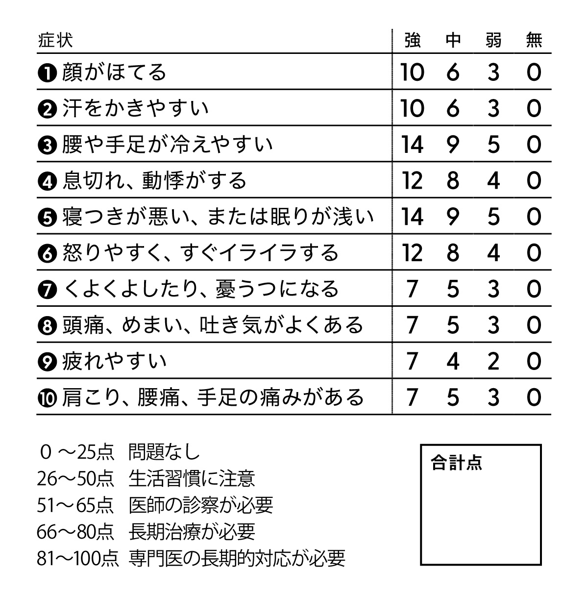 無症状から強く症状が出ているものまで、各項目ごとに症状のレベルをチェック。合計点で更年期障害レベルを割り出す。
