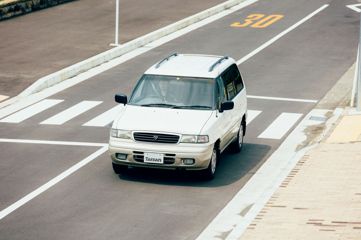 ホワイト×ベージュのツートーンカラーに、いかにもベストファーザー感たっぷりなビッグボディ。「母さん、あれは一体何というクルマだね?」という質問がお茶の間で飛び交ってもいそうだが、実はあれ、90年代マツダを代表するSUV。