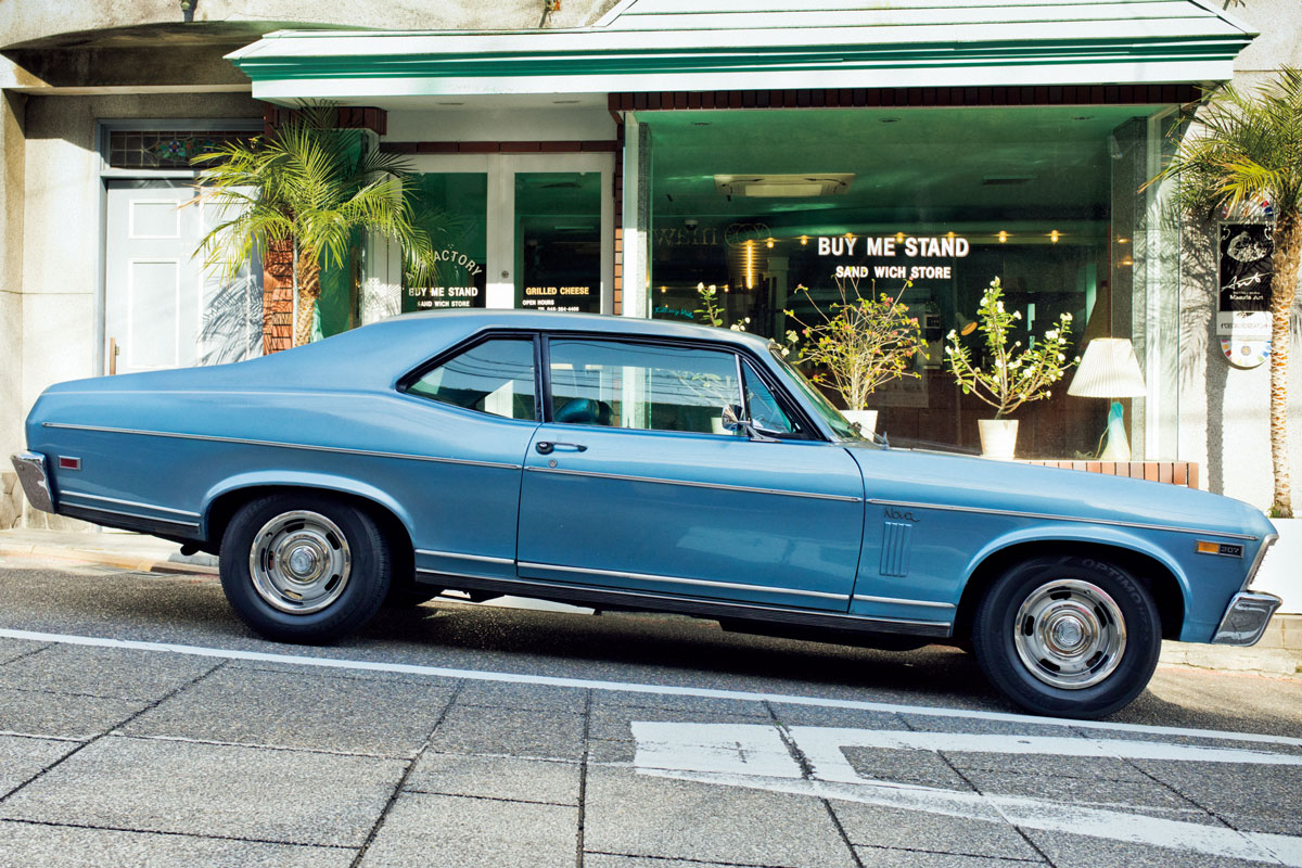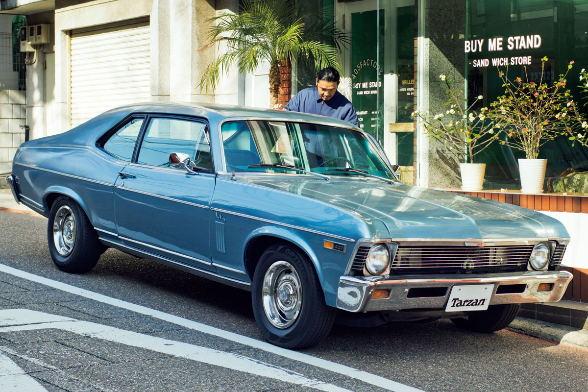 横浜は元町、山手エリアに抜ける坂の途中、サンドイッチ店〈バイミースタンド 元町〉の前に年季の入ったアメ車が停まっていれば、それは店主・江口真吾さんの愛車だ。1969年式のシボレー《ノヴァ》。クエンティン・タランティーノの映画『デス・プルーフ』の主人公が駆るメインマシンと同じ3代目(1968年〜1974年)であり、60年代後半のアメリカを代表する大衆車である。