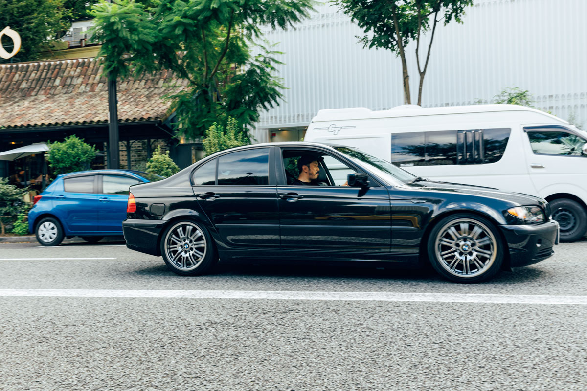 「最近は外車も日本車もEV化の一途を辿るなかで、ガソリン車のエンジンの最高傑作を今味わっておかなきゃと、妙な使命感に駆られて。それを積んだ車種としては最終系である2005年式の325iを選びました。走りですか? ドイツ車らしい地を這うような走行感がたまらなくいいですね。その感覚を2倍増しにしたく、車高をほんのり下げて。シルキーシックスならではの、低く唸るような排気音をもっと強調するため、マフラーはイタリアの老舗メーカー〈スーパースプリント〉のものに変更。でも、僕は走り屋では決してないので、ホイールは、3シリーズの1クラス上の《M3》純正のホイールを嵌めて、あくまでトレンディな見た目は崩さずに。まだまだカスタムは途中の段階ですけどね」