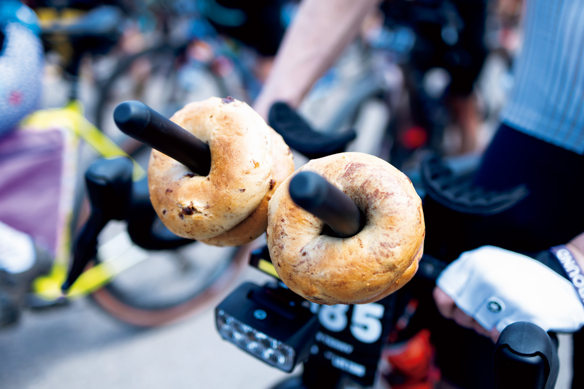 空気抵抗の少ない姿勢がとれるようにブルホーン(牛の角)形ハンドル。補給食のベーグル差しにもなります。