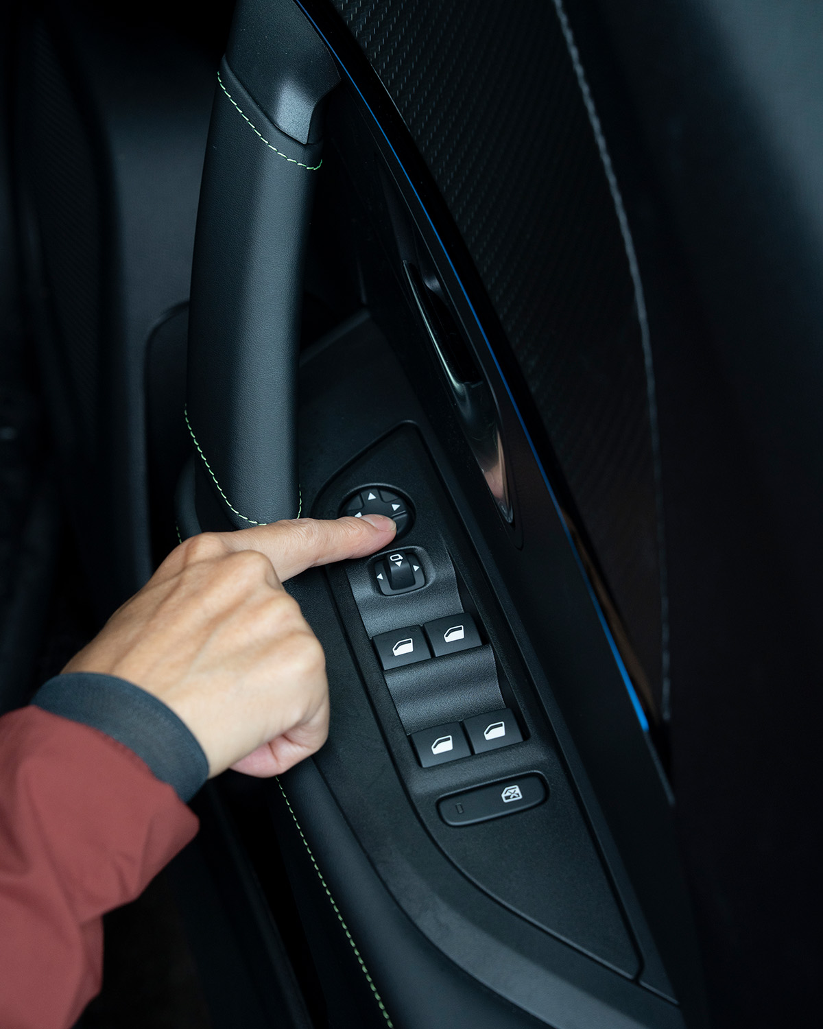 内装には、カーボン調のテクスチャーとライムグリーンのステッチ。中央には使用頻度の高い機能がトグルスイッチになって並ぶ。