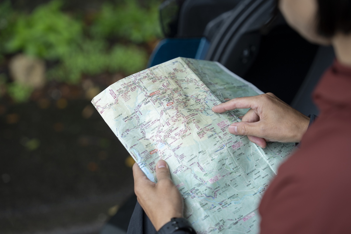 電波の届きづらい山中では、地図もアナログ版を携行する。