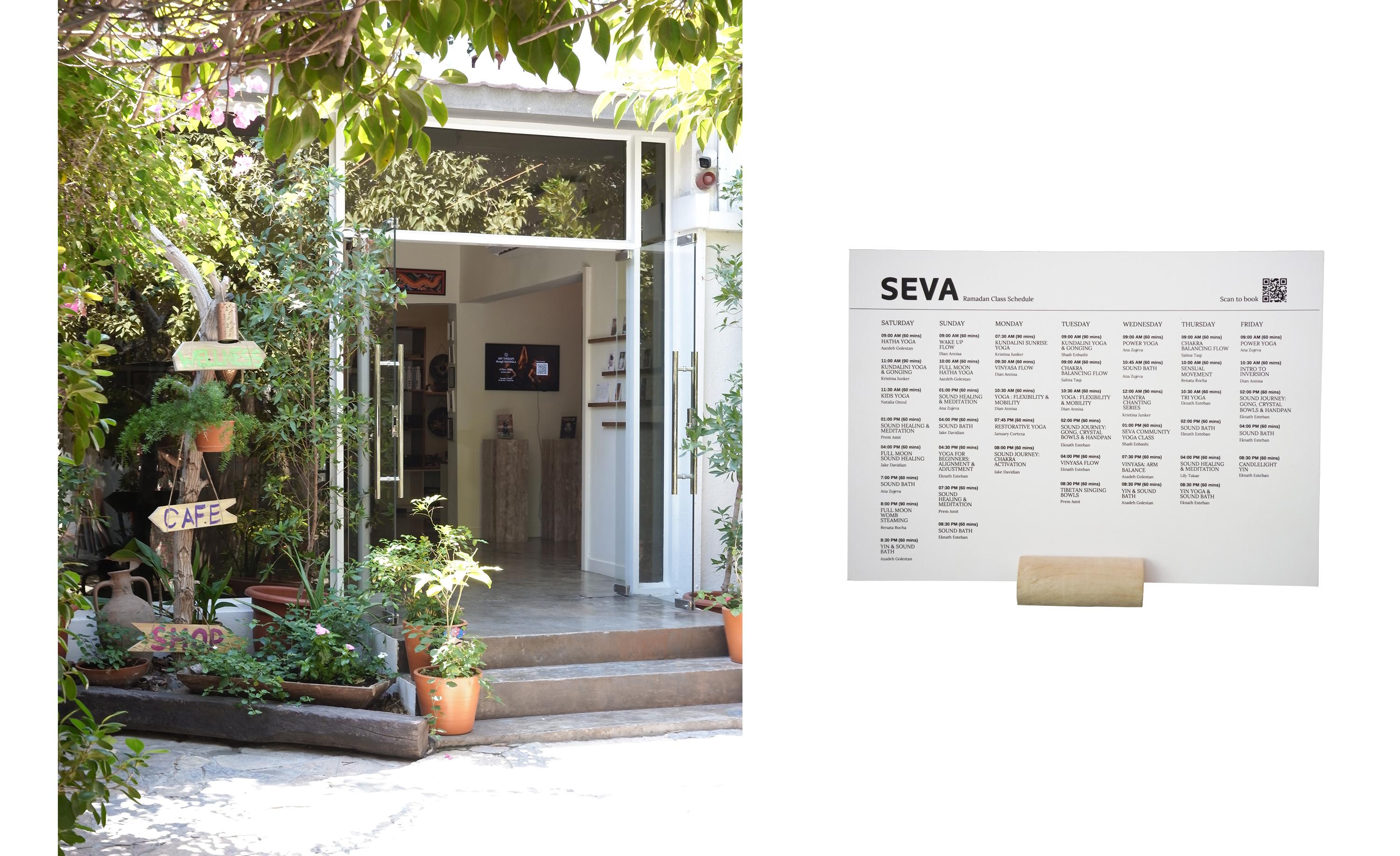 左/《SEVA Wellness Center & Cafe》のエントランス。 右/開催されているプログラムの一覧。