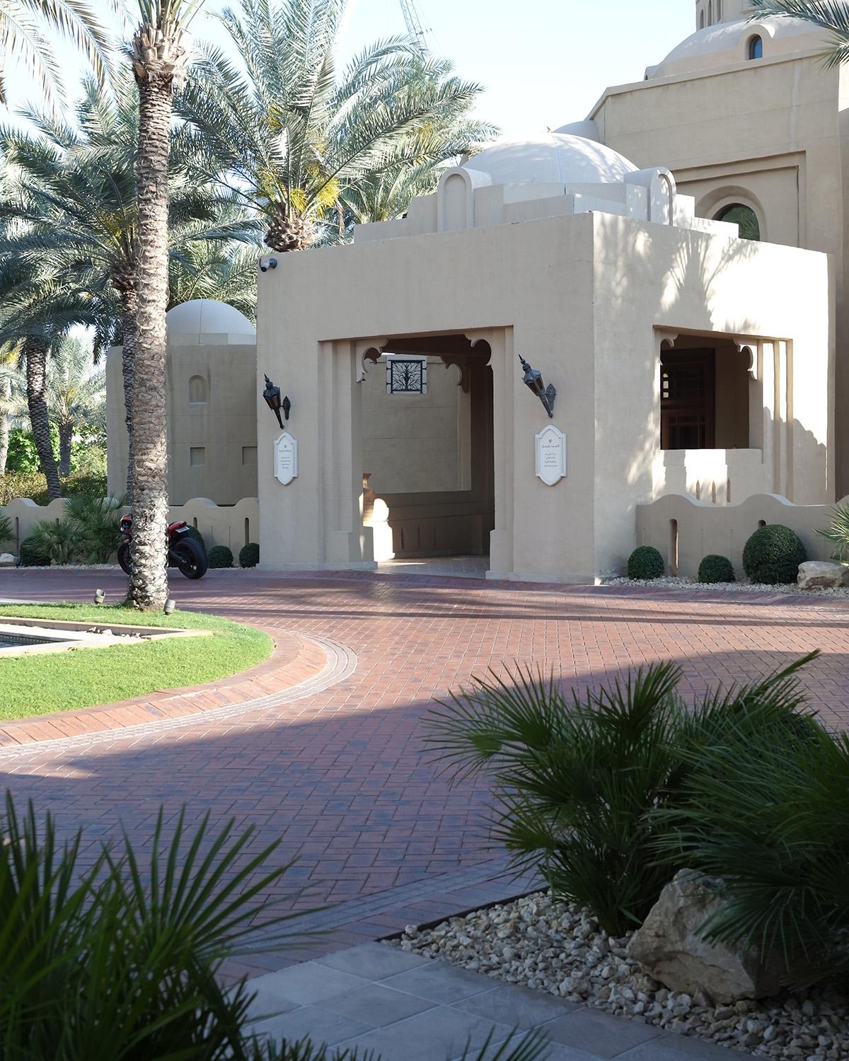 〈One & Only Royal Mirage〉の外観。高級車が次々と車寄せに停まっていく。余談だが、UAEは石油の産油国にもかかわらず、ドバイで最も見た車は電気自動車の〈テスラ〉だった。