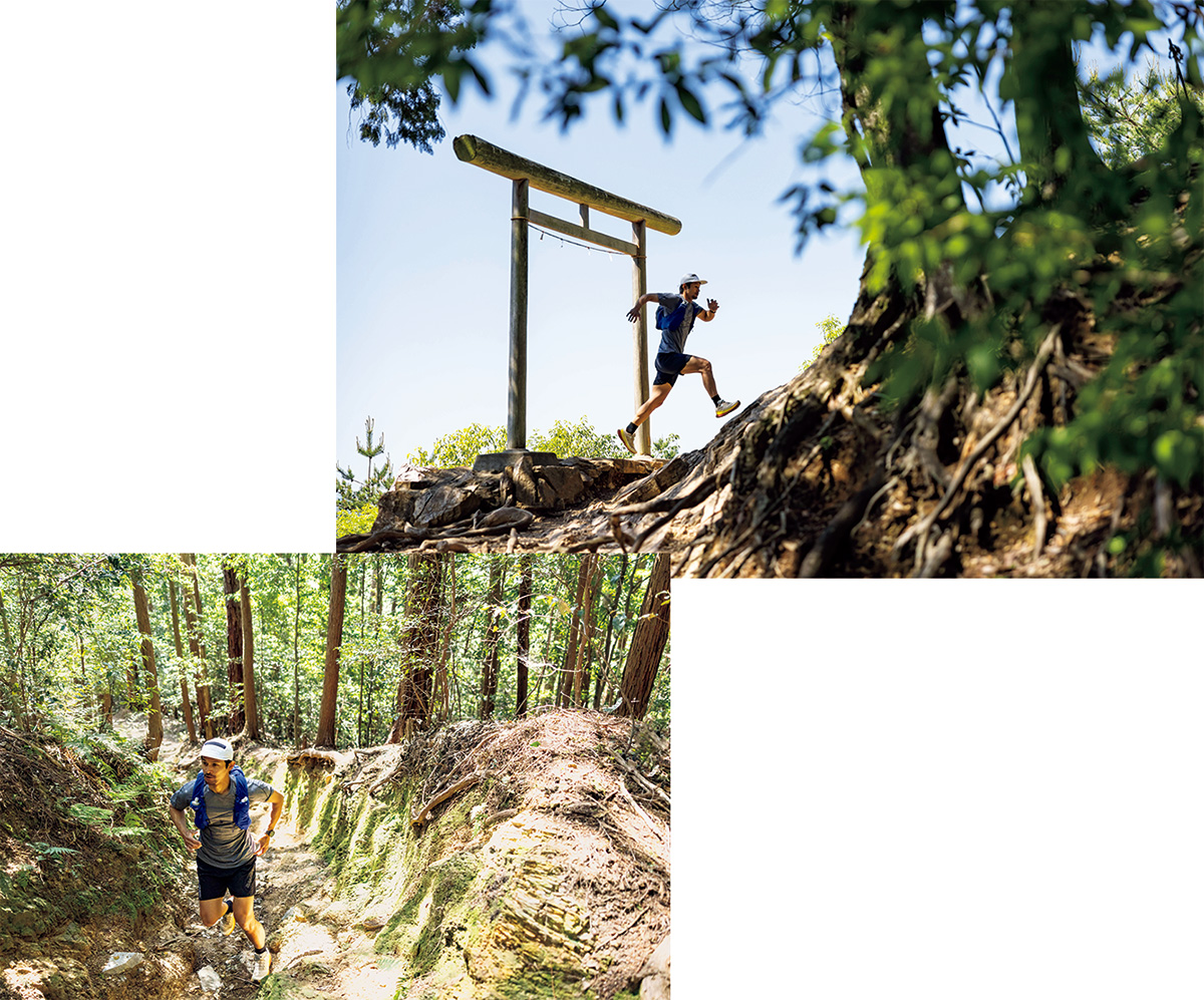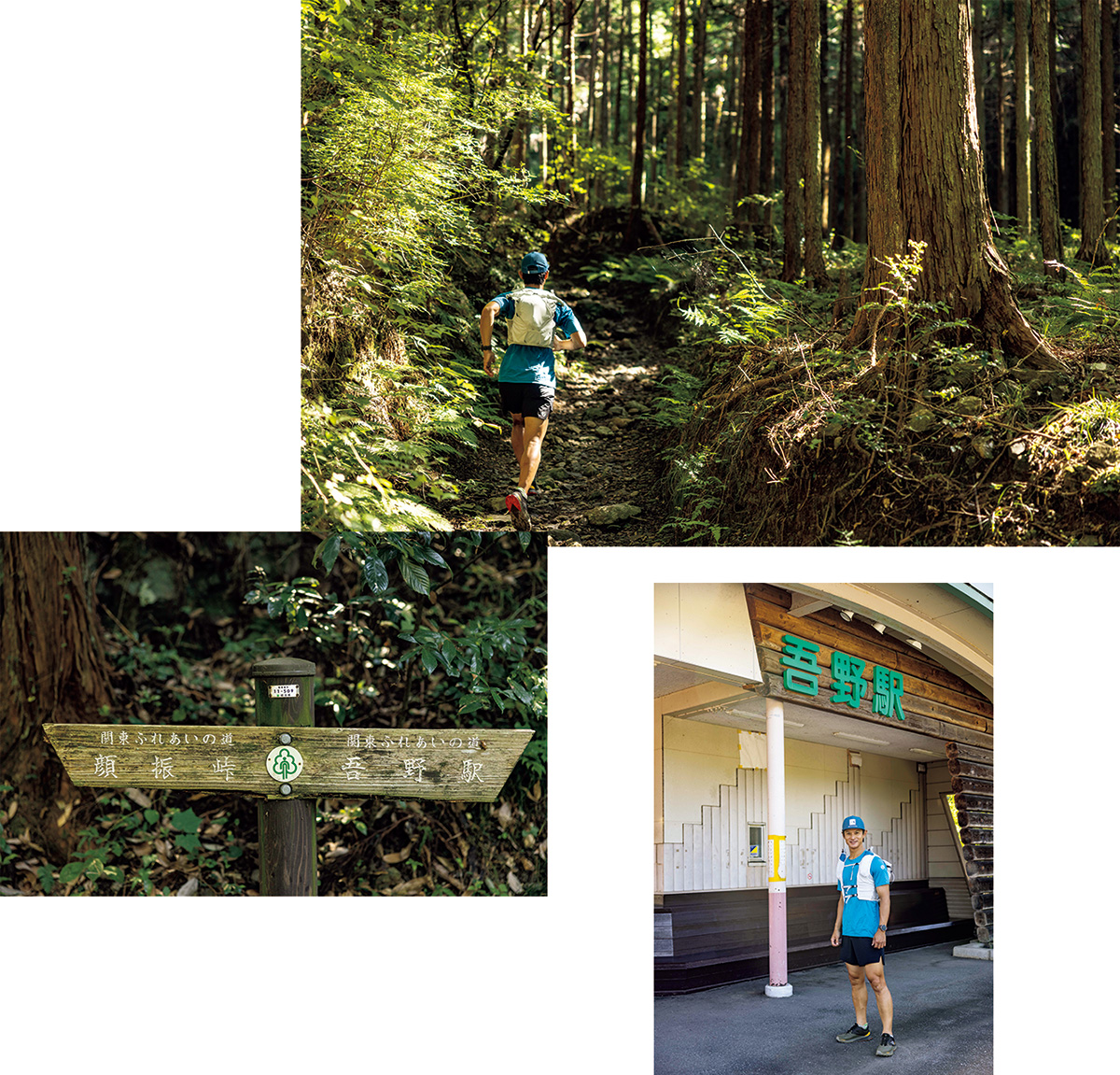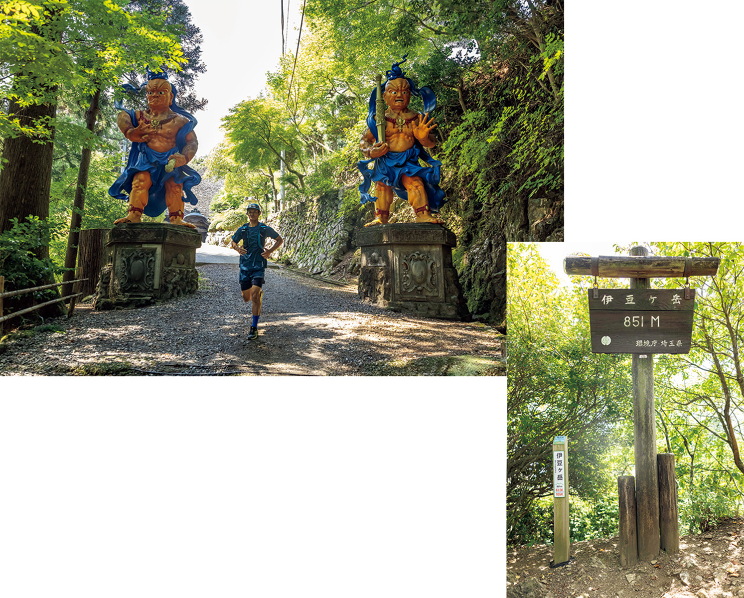 飯能駅の2つ先、高麗駅からGPS通りに進むと15分ほどで日和田山登山口。この先でトレイルは男坂、女坂と分かれて、男坂は岩だらけです。世界初、女性としてエベレスト登頂に成功した田部井淳子さんが登攀のトレーニングで通った男岩、女岩がすぐ近くです。ランナーは土の道、女坂を進みましょう。