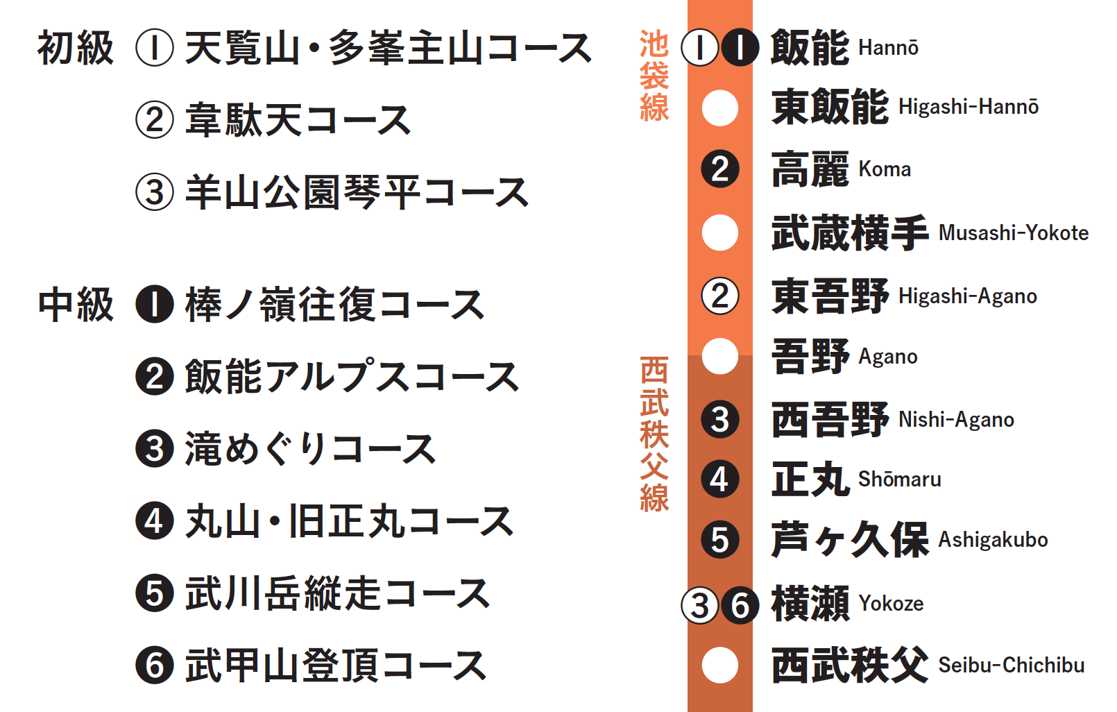 下の「QRコード」をご確認ください。西武線沿線には他にもたくさんのコースがあります。ここでは初級、中級者向けのコースを紹介しましょう。なお、西武線が終点の西武秩父駅に近づくと、周辺の山は奥深く、大きくなることをご承知おきください。
