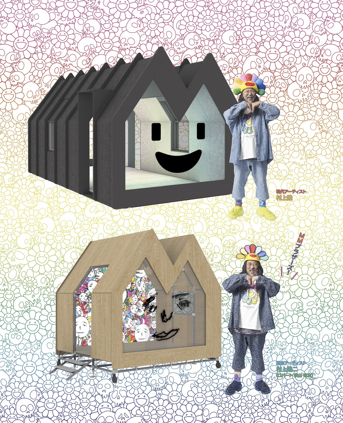 ロゴを立体化したイメージ図。上は村上隆による家。下はコメディアン・ロバート秋山が村上隆に扮した「村上隆二」による家。