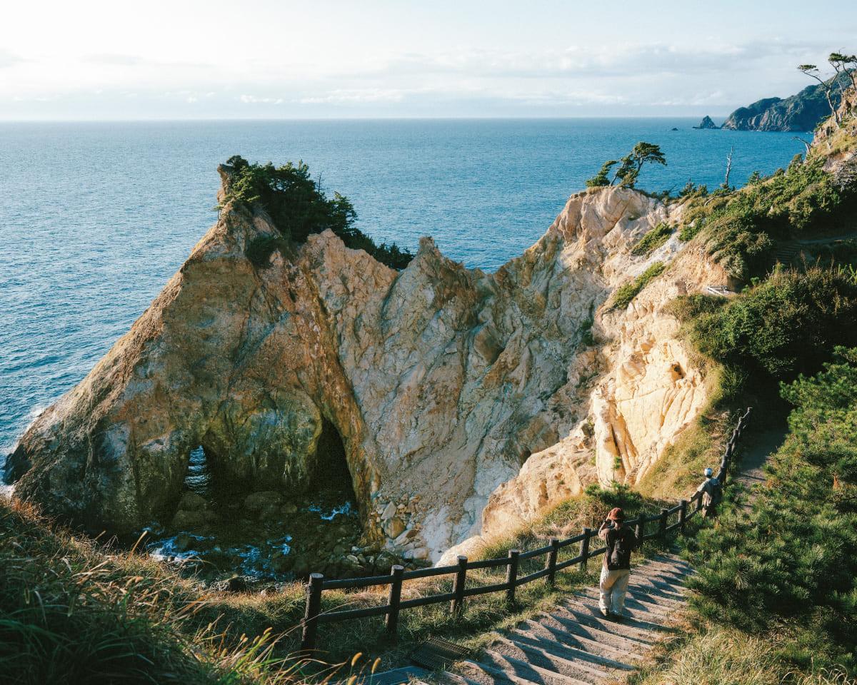 今回のコースのゴール地点である黄金崎。奇岩百景にも選出された馬ロックに当たる夕陽は一見の価値あり。岩肌が白っぽいのは温泉成分によって岩が変質したからだという。