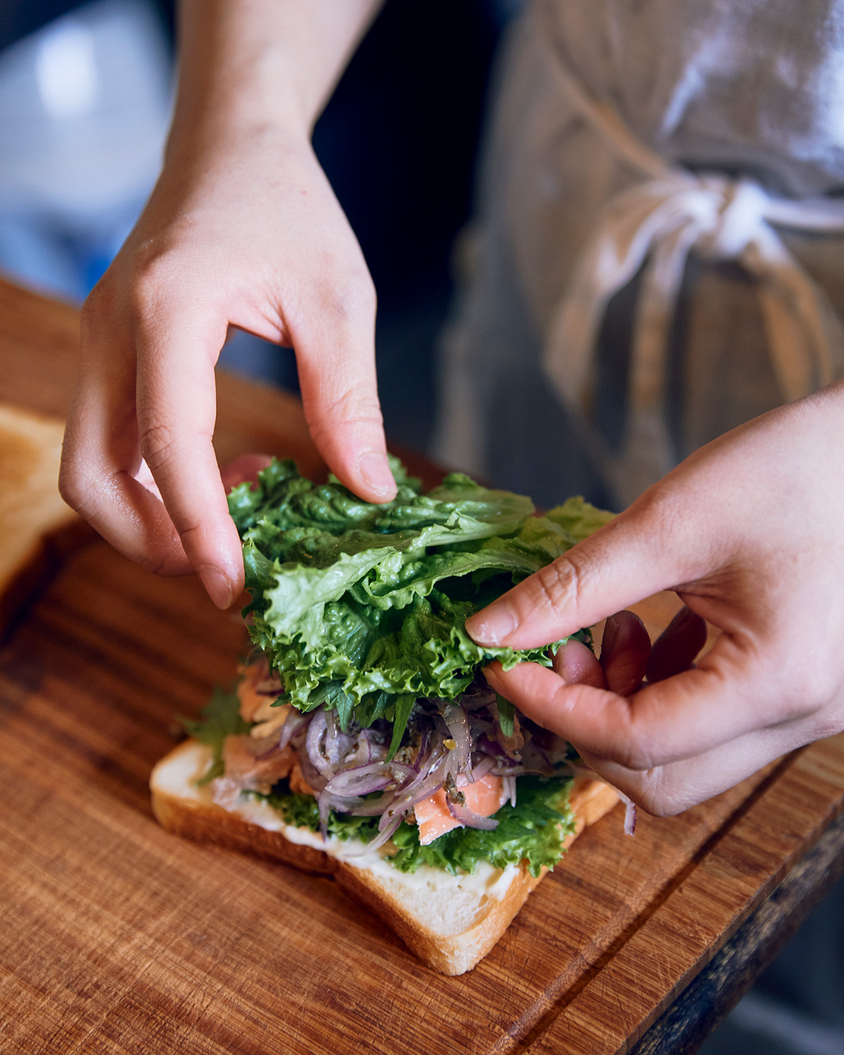 何度も試作を重ねてたどり着いた、オリジナルの味。クリームチーズを塗ったパンに、サーモンと大葉、紫玉ねぎをサンド。オリーブやケーパーを刻んだタプナードソースが深みを添える。