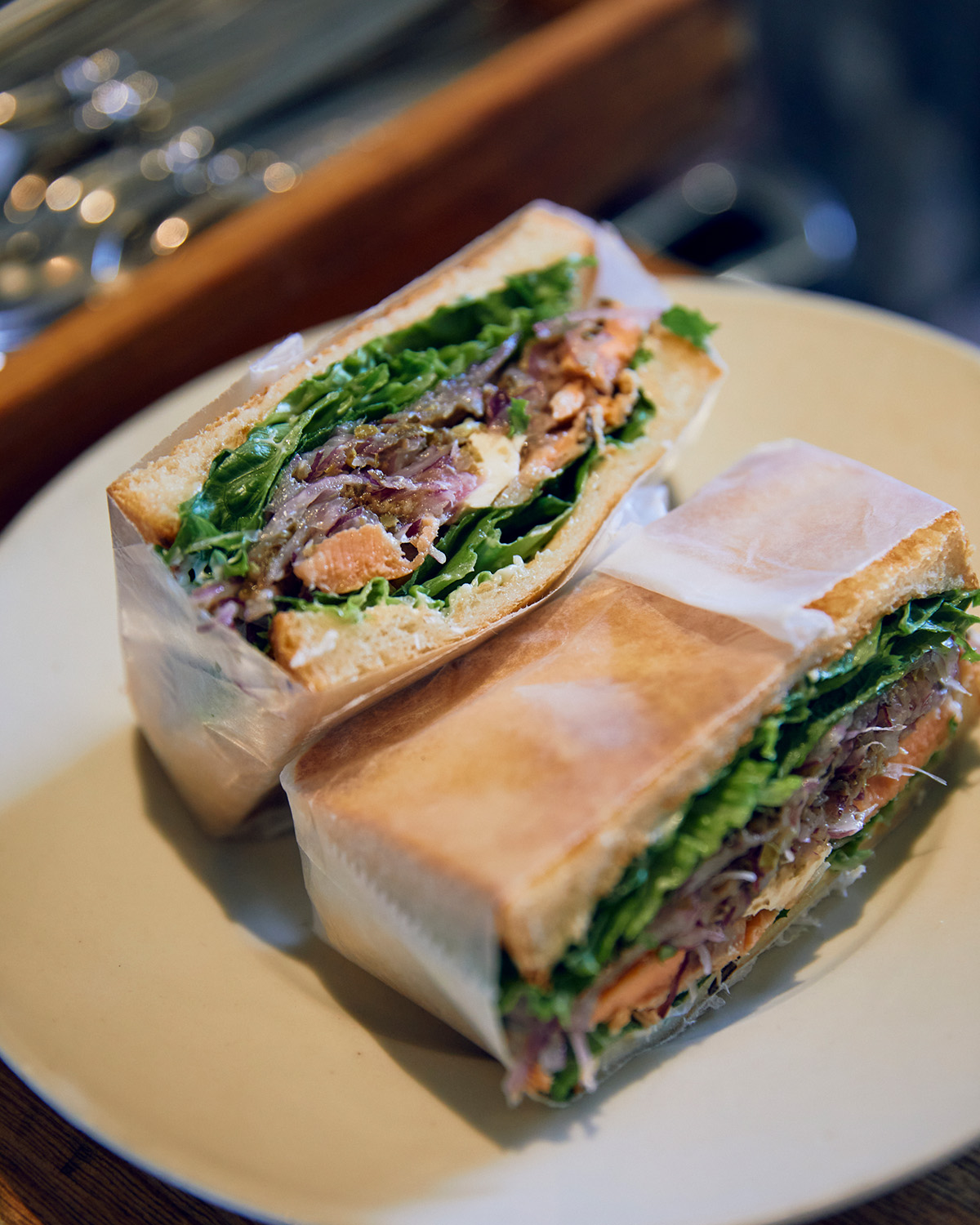 テイクアウトもできるので、鴨川や京都御所で食べるのもおすすめ。グリルサーモンサンドイッチ ¥1,300。