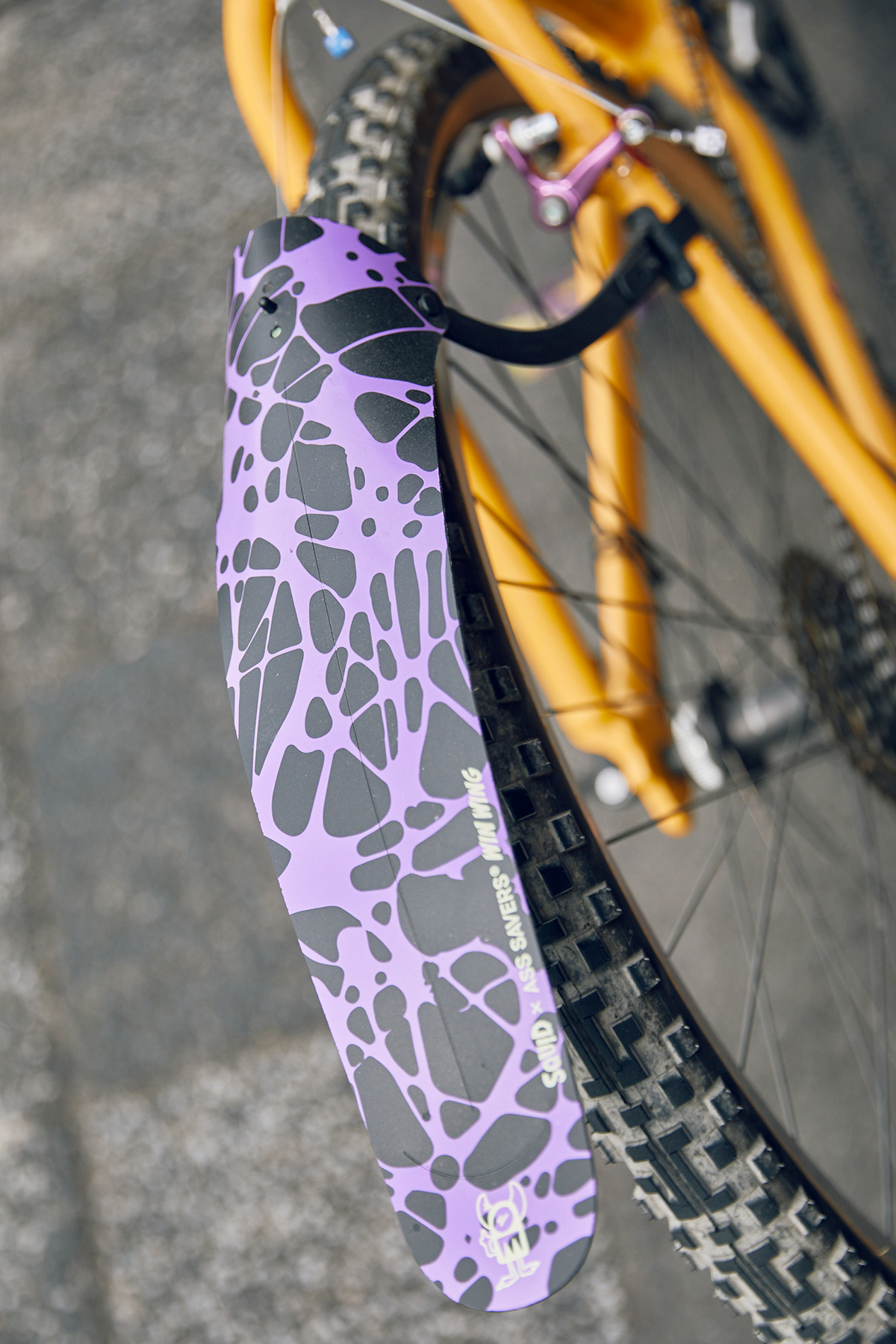 クリップオン式の泥除けは、工具いらずで数秒で取り付けられる。膝上から背面全体をしっかり守ってくれる優れもの。