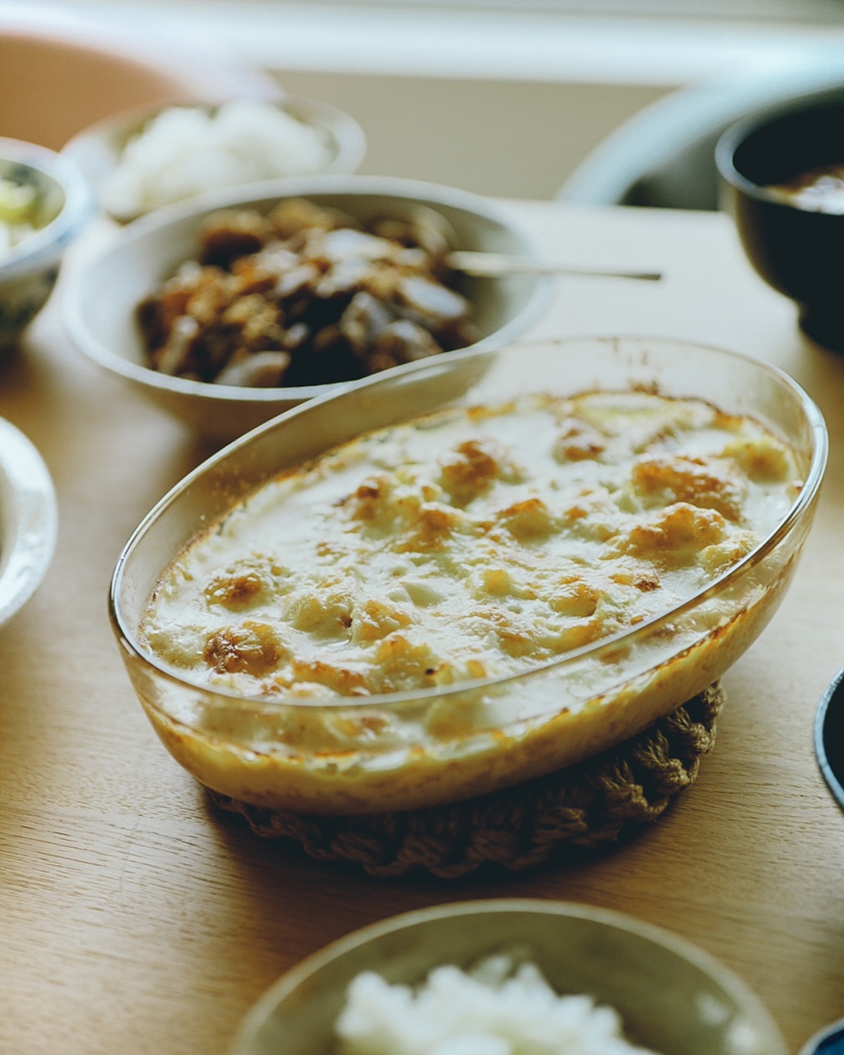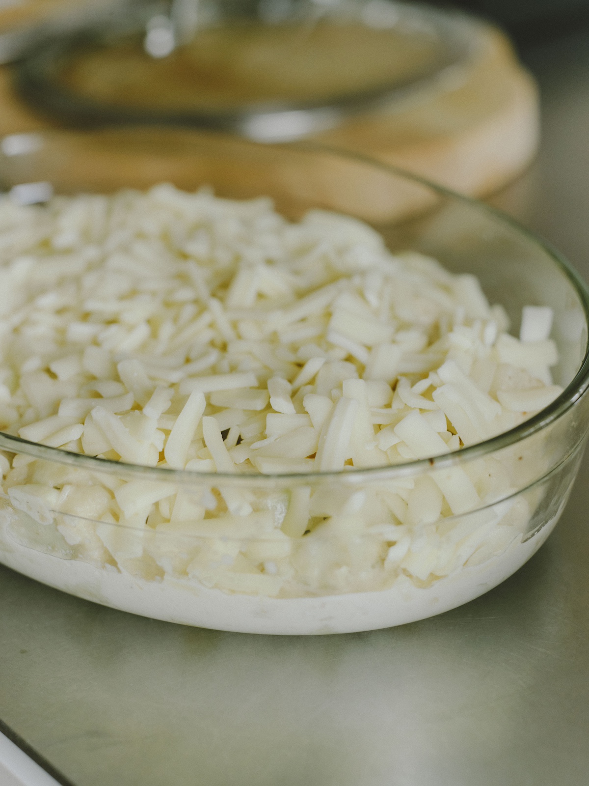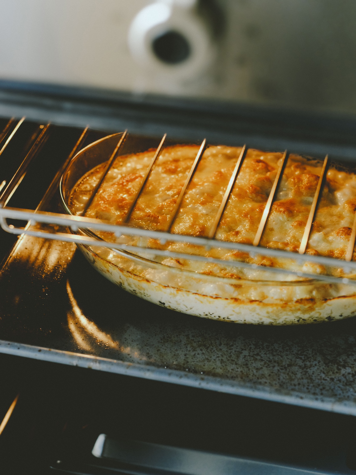 4.耐熱皿に移し、全体に好みのチーズを乗せ、180度のオーブンで焼き色がつくまで焼く。