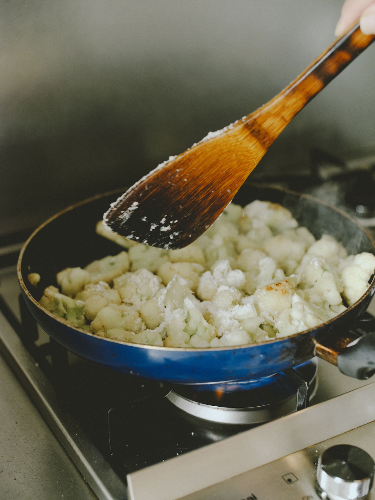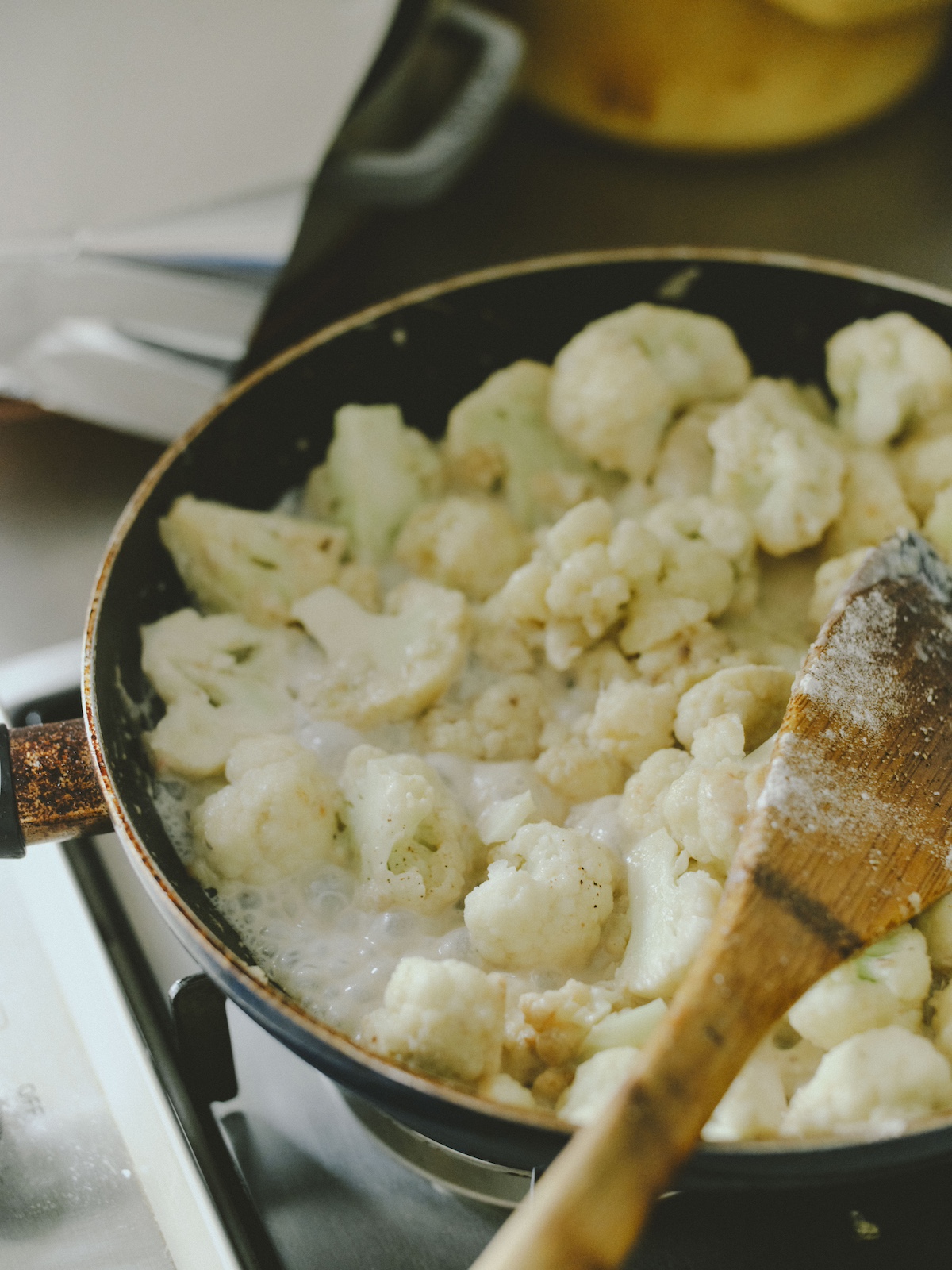 2.フライパンにバターの半量、玉ねぎを入れて透き通るまで中火で炒め、カリフラワーとアンチョビを加えて全体を炒め合わせる。バターの残りを加えたら弱火にして、小麦粉を入れ全体をよく馴染ませる。