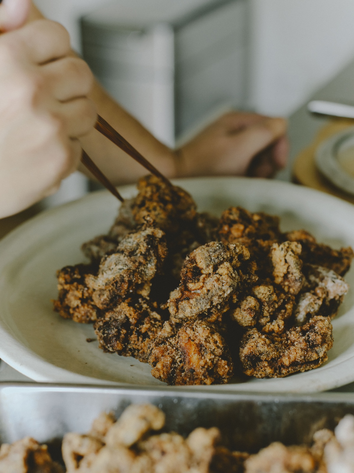 醤油で味付けした唐揚げと豚汁。