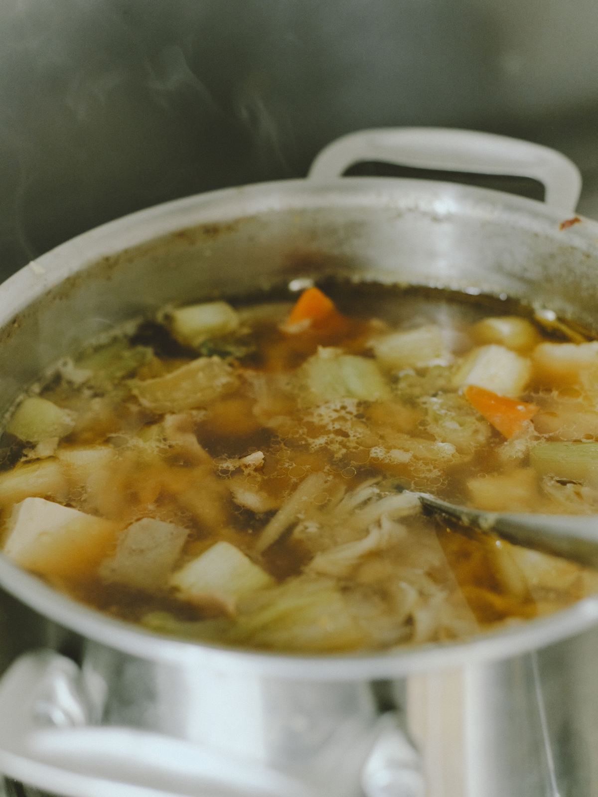 3.牛乳を加えたら、だまにならないようによく炒める。最後に生クリームを加えてから、塩麹ニンニクペースト、塩、こしょうで味を整える(もったりしすぎた場合には牛乳を加えて調整する)。