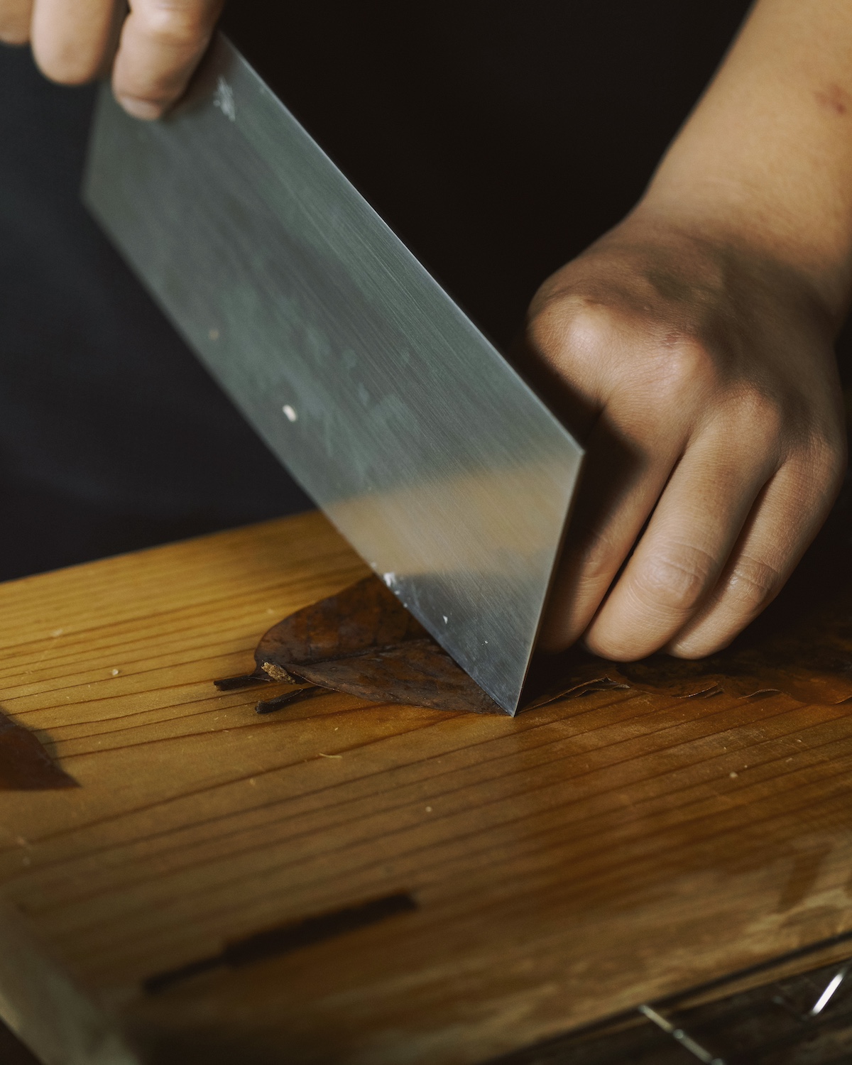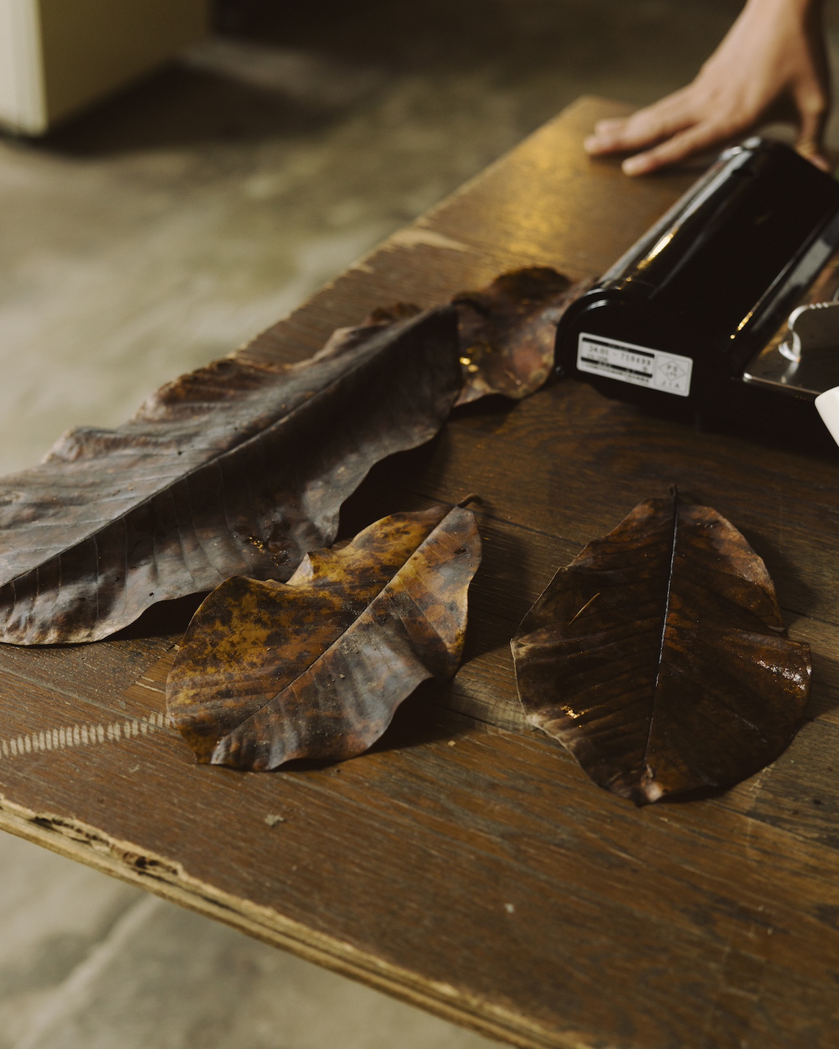 それから冬になる前に落葉した枯れ葉も、香りづけによく使われています。ただし、落ち葉となり発酵、分解が進みすぎると土のニュアンスが強くなってしまうので、拾うタイミングも大切。味噌を乗せて焼く朴葉味噌が有名ですが、葉を加熱することによって、あの香ばしさが匂い立ちます。熱を加えて香りを引き出したところを蒸留するという方も。