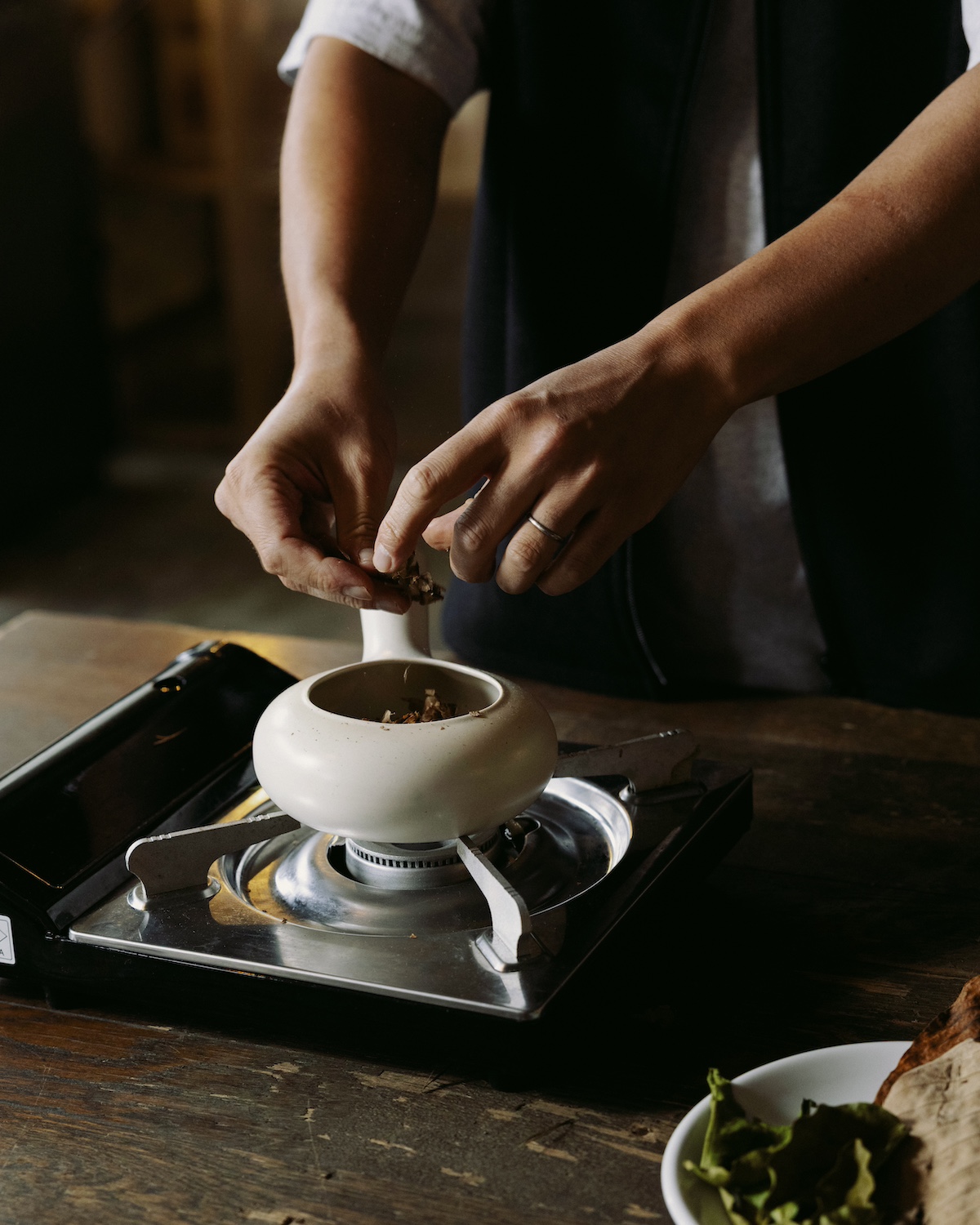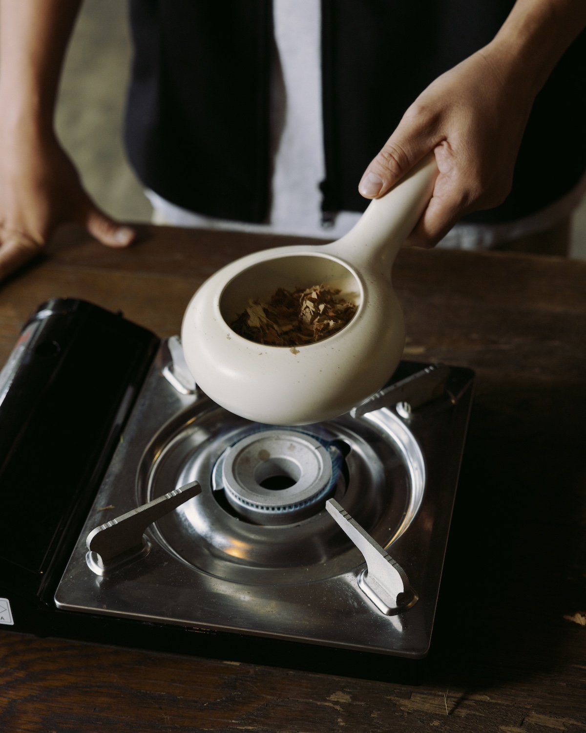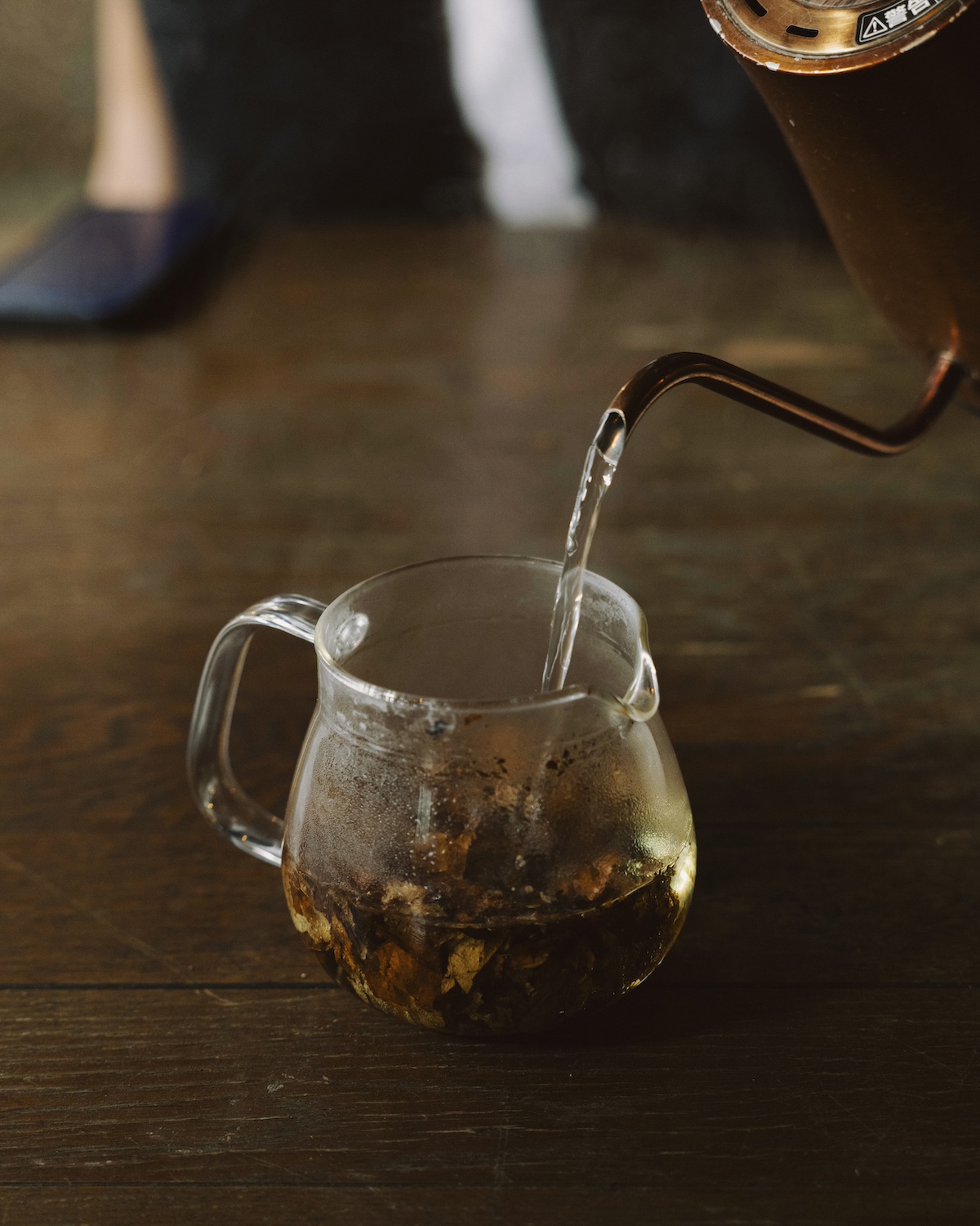 焙煎は、茶葉やコーヒーでもよく知られているように、その度合いによって味わいや香りが変わります。ハーブスタンドでは、さまざまな植物を焙煎し、探究していますが、特に青臭さのようなものを飲みやすく変化させるには、焙煎が有効だと感じています。ただし深煎りしすぎてしまうと、その植物本来の個性も消えてしまいます。私たちは生産者でもあるので、その個性がより生きるローストを心掛けています。朴葉のお茶には、とても豊かな風味と、甘さがあります。ぜひ楽しんでみてください。