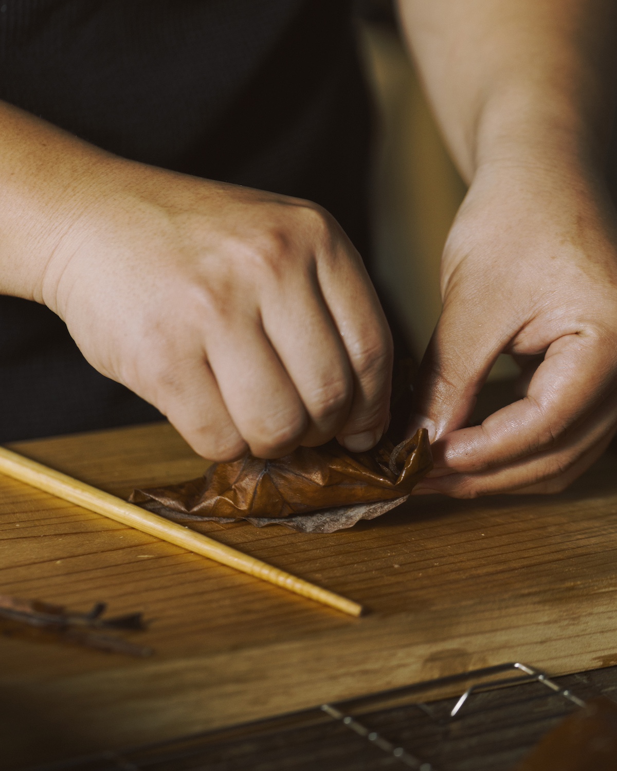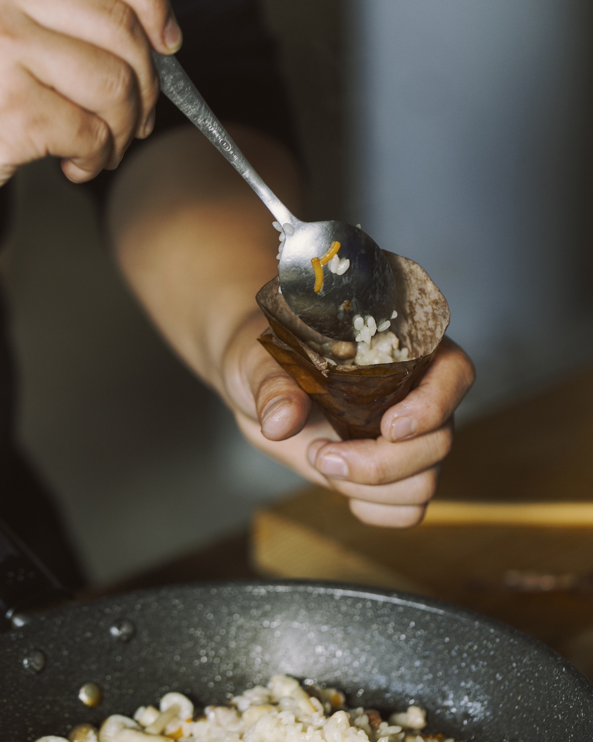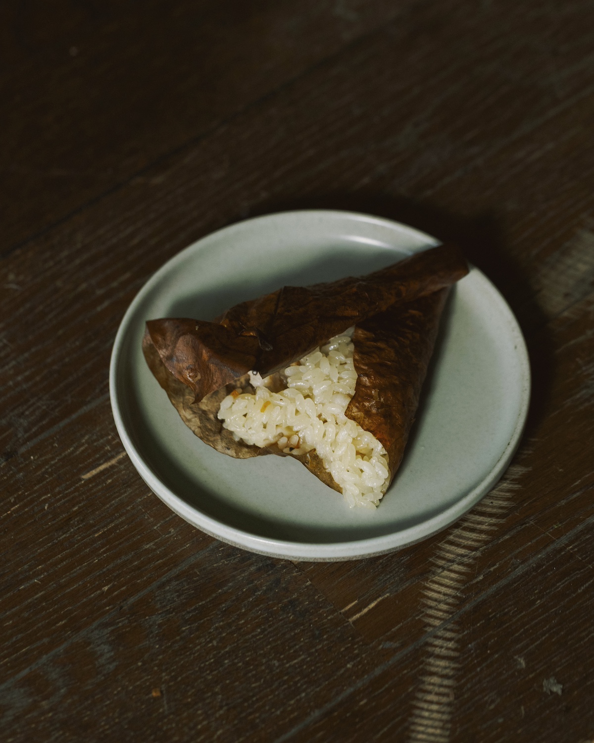 竹の皮を使って包むことが多い「ちまき」ですが、今回は朴葉で和風のちまきを作りました。朴葉はあまり市販されていないので、自分で落ち葉を収穫し、乾燥させるというプロセスもぜひ楽しんで欲しいと思います。料理のポイントは、ドライの朴葉を柔らかくするために浸しておいた水を出汁のように使うこと。風味をできるだけご飯に閉じ込めていきましょう。それから、繊細さを活かすために、香りの強くない米油を使っています。前日からの準備が必要で、少し手間はかかりますが、日本の豊かな季節を堪能できる料理です。