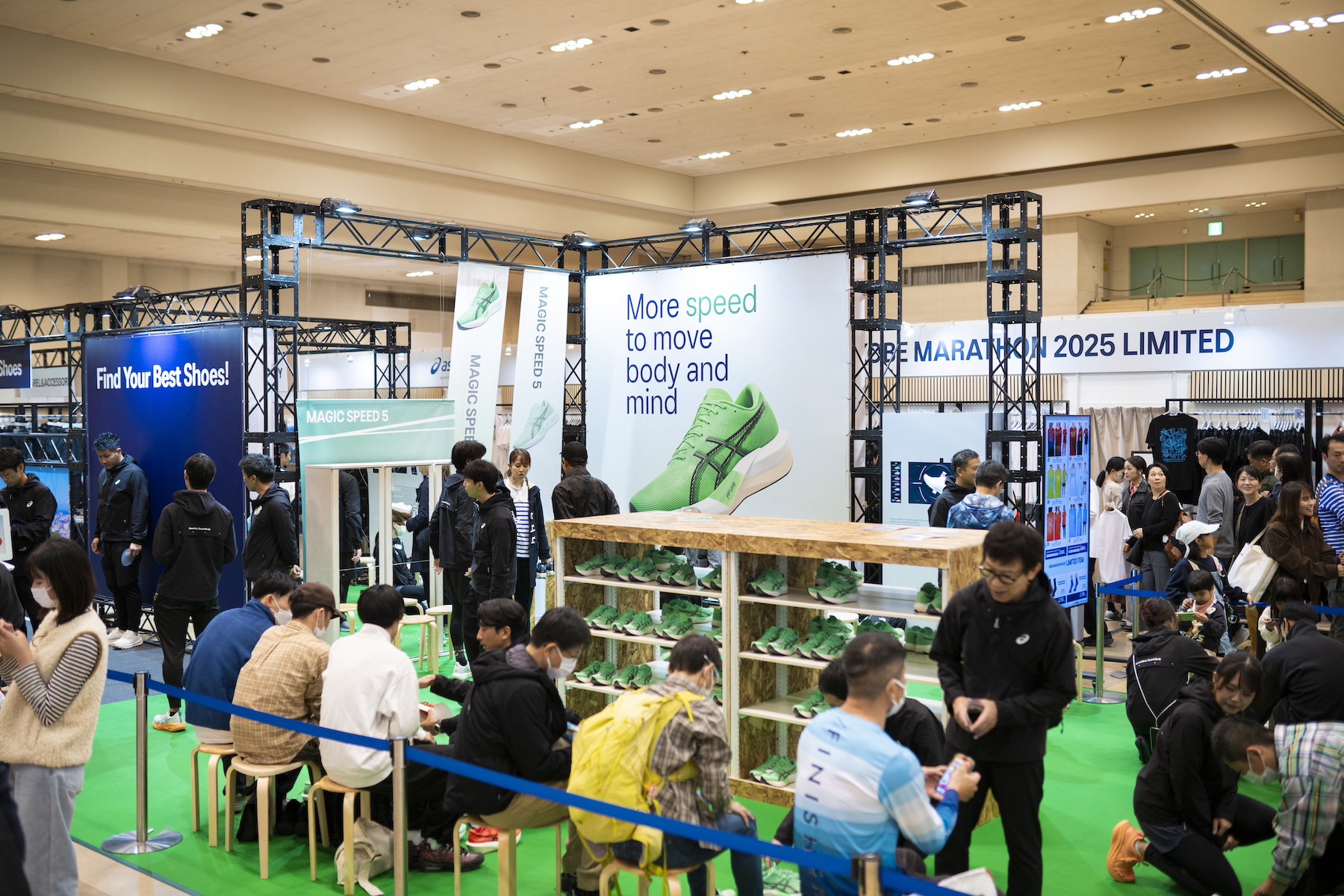 『神戸マラソンEXPO 2025』でのアシックスブースの様子。初披露となった《MAGIC SPEED 5》をチェックする方たちの行列が絶えない。