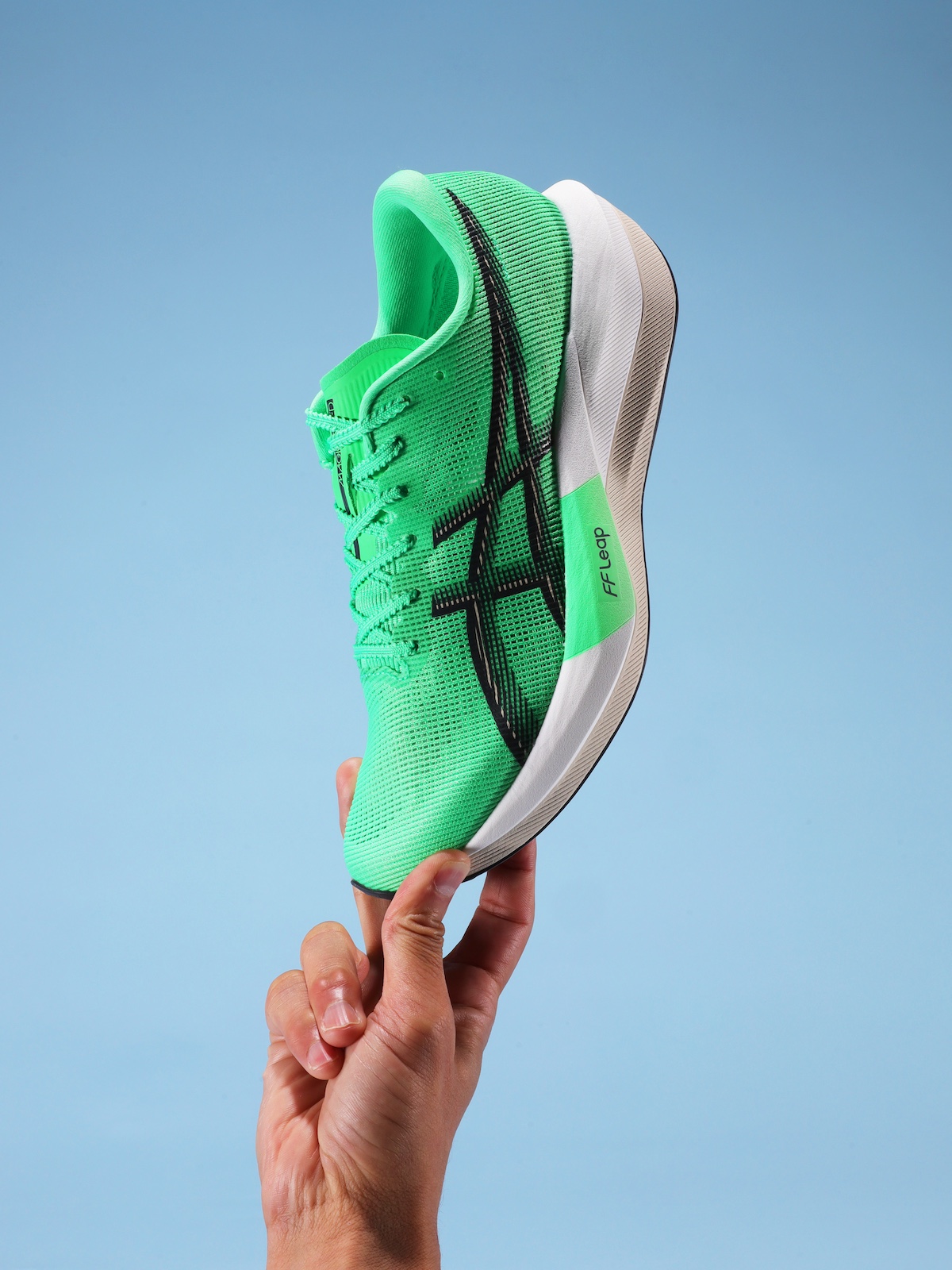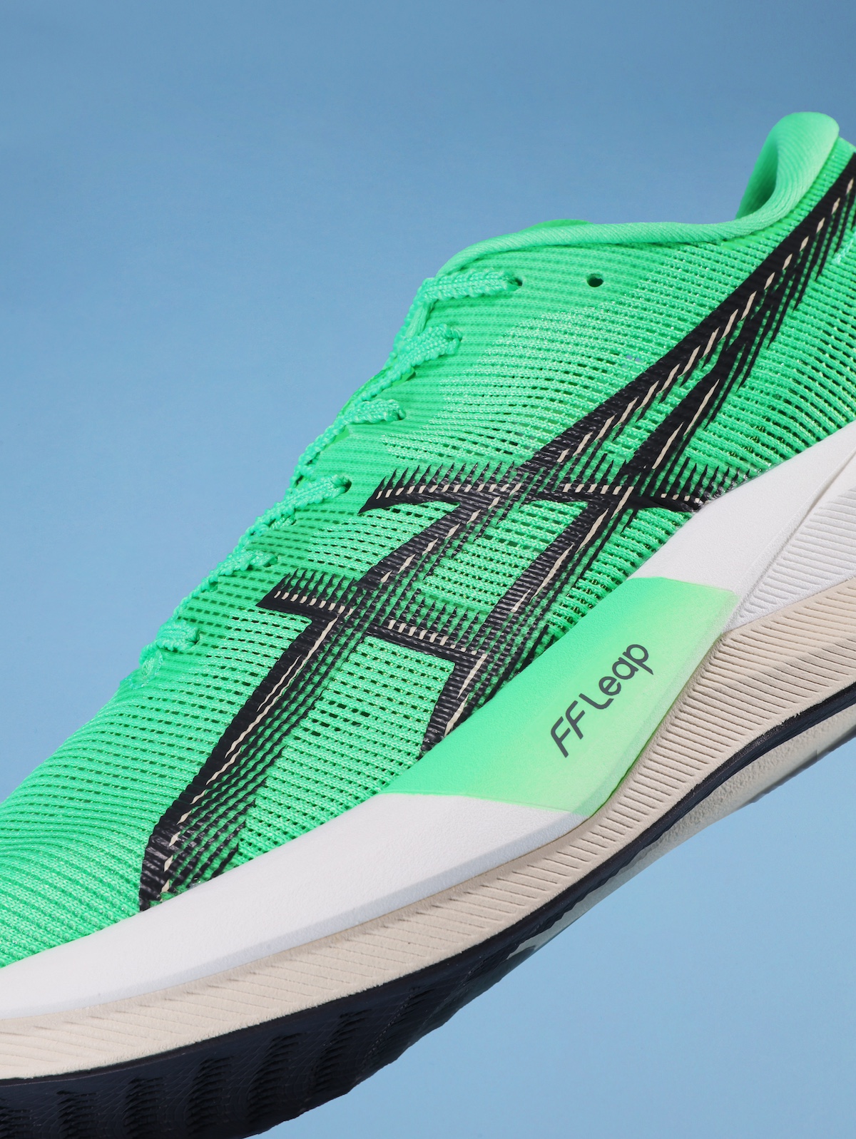 《MAGIC SPEED 5》のミッドソールは2層構造。前作は、トップ(プレートの上層部)、ボトム(プレートの下層部)ともにFF BLAST PLUS(エフエフブラストプラス)という素材を採用していたが、今作では上層部に新素材、FF LEAP(エフエフリープ)が使用された。トップレーシングシューズ《METASPEED TOKYO Series》にも使われている素材で、アシックスのクッションフォーム材の中で最も軽く、優れた反発性を発揮する。今年9月に開催された世界陸上でも、FF LEAPが採用されたレーシングシューズで多くのアスリートが躍動したが、その優れた機能性を《MAGIC SPEED 5》でも体感できるというわけだ。