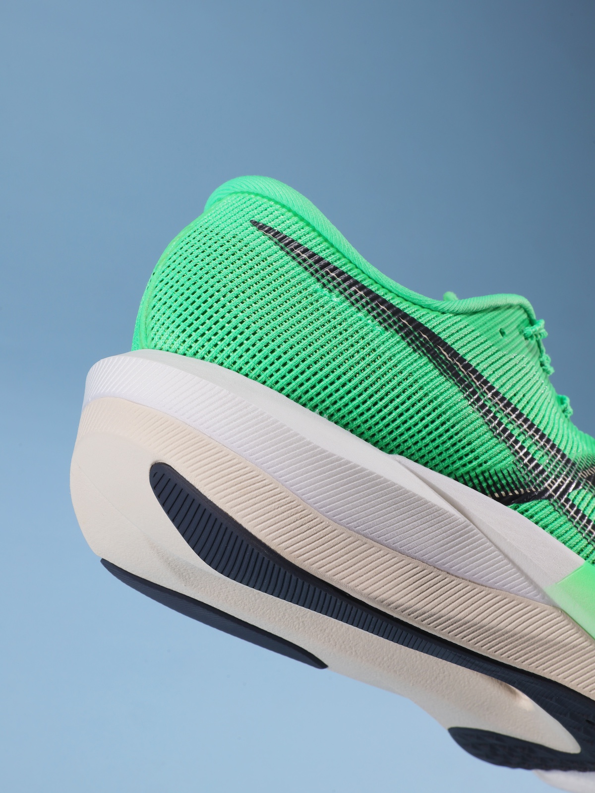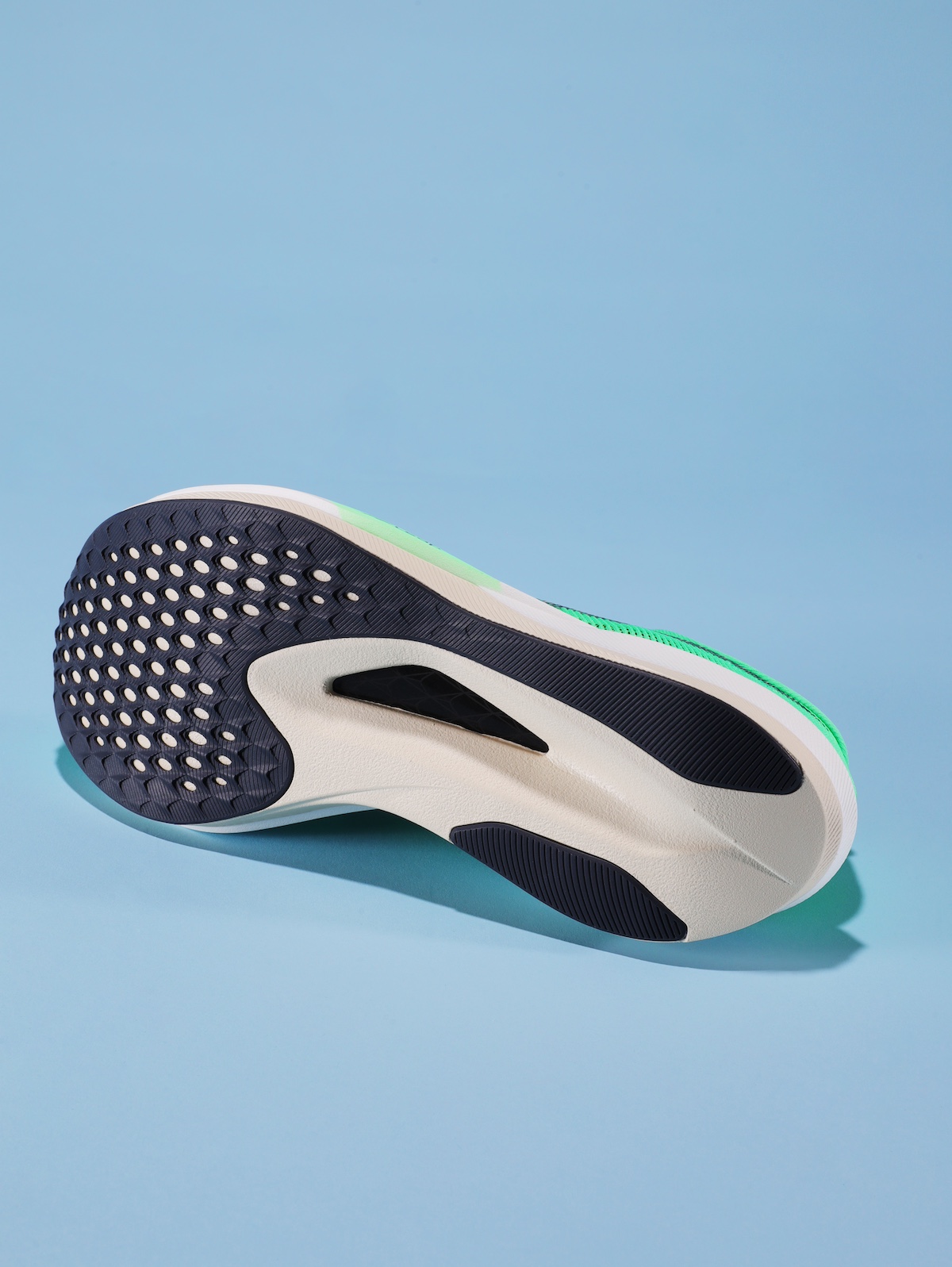 靴底の中央に見えているのがカーボンプレート。高反発なミッドソール素材と組み合わせることで、大きなエネルギーリターンが得られ、重心移動も滑らかに行える。レースで自己ベスト更新を目指すランナーの大きな助けとなってくれるだろう。