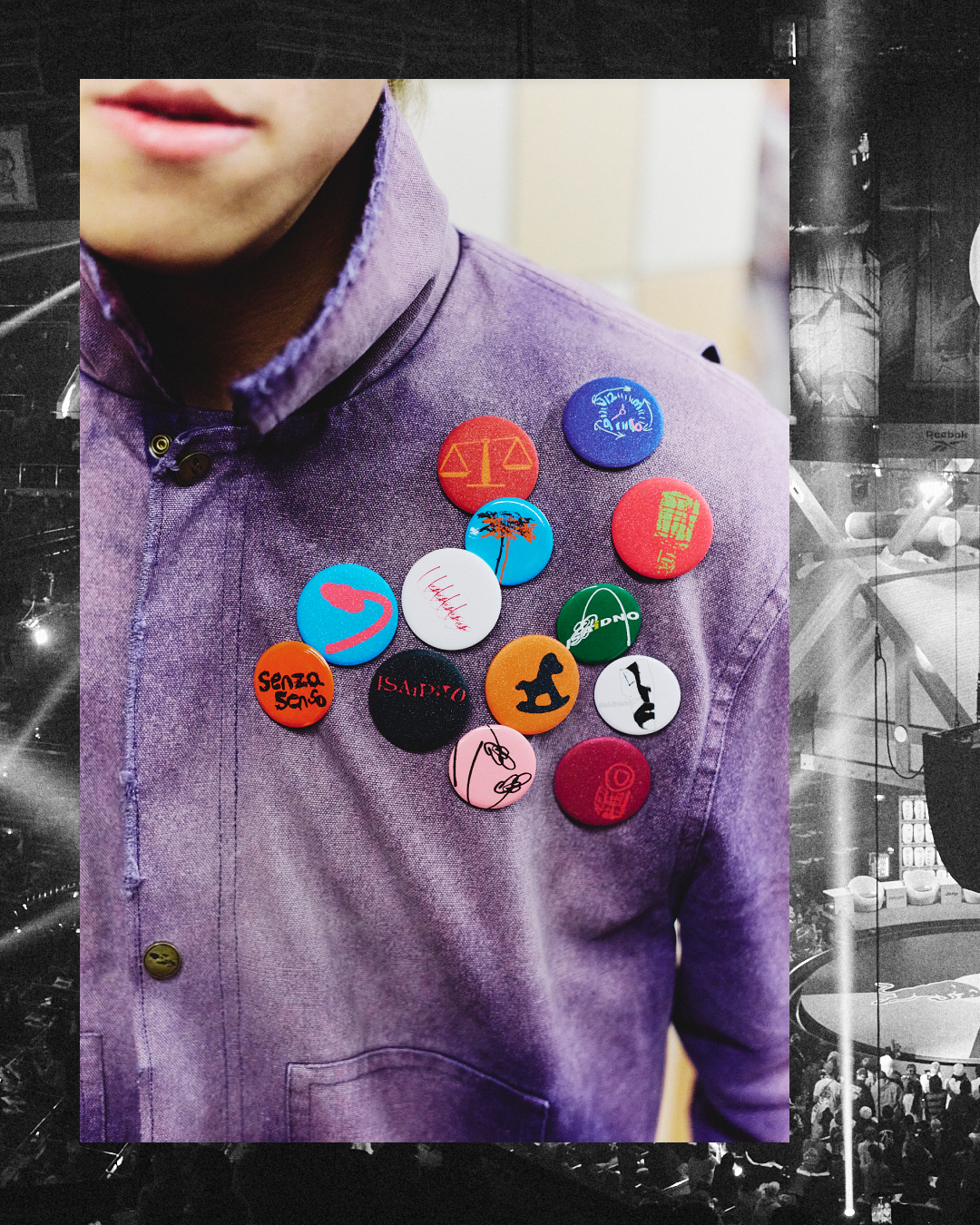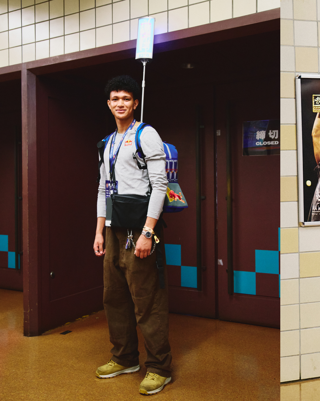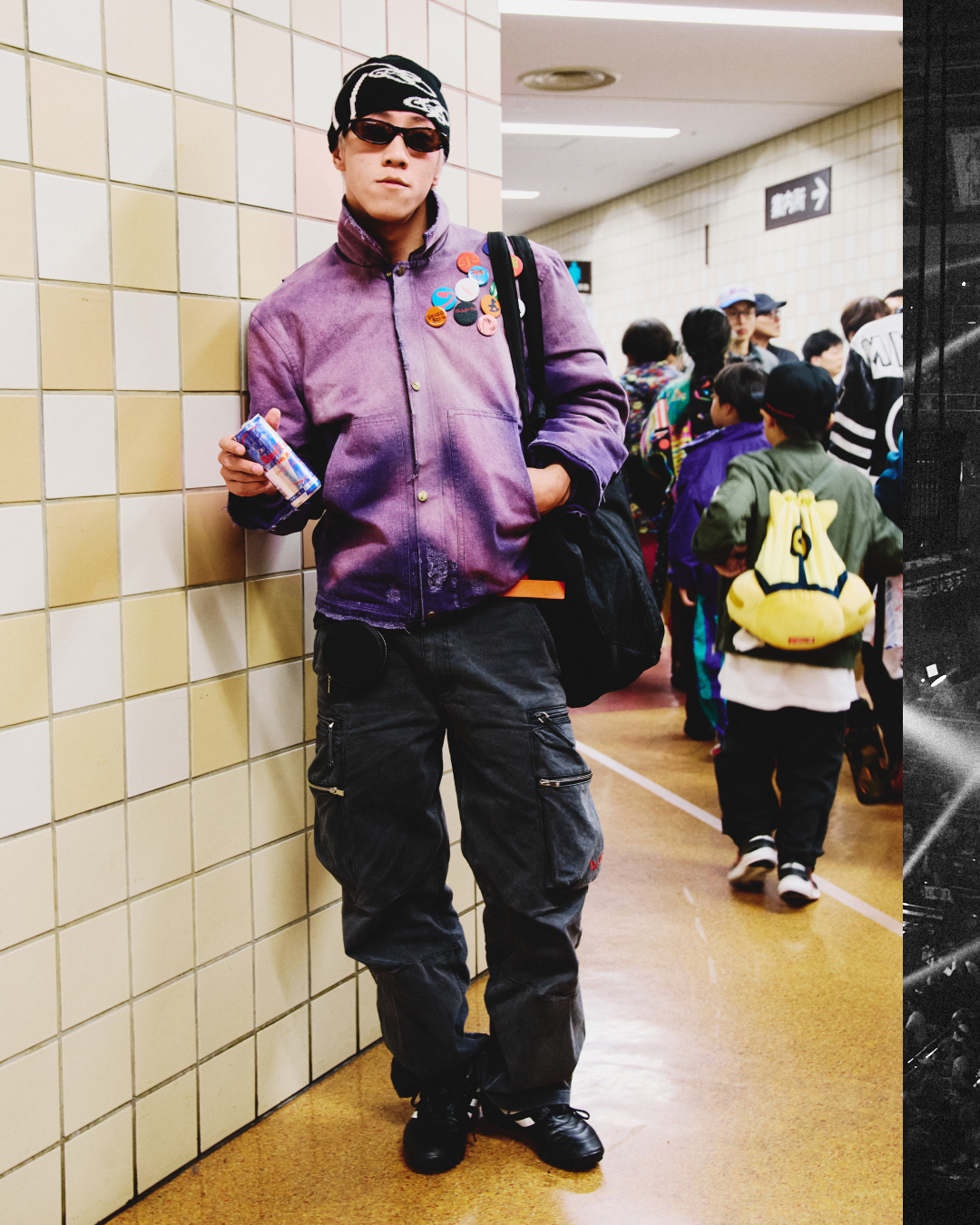 試合を終えたタイミングでキャッチした彼は、中国から来場したという。パープルのジャケットには缶バッヂをびっしり並べてオリジナルアレンジ。「自分の色を出したかった」と語り、遠征先でも表現者らしい遊び心を忘れない。@grav1ss