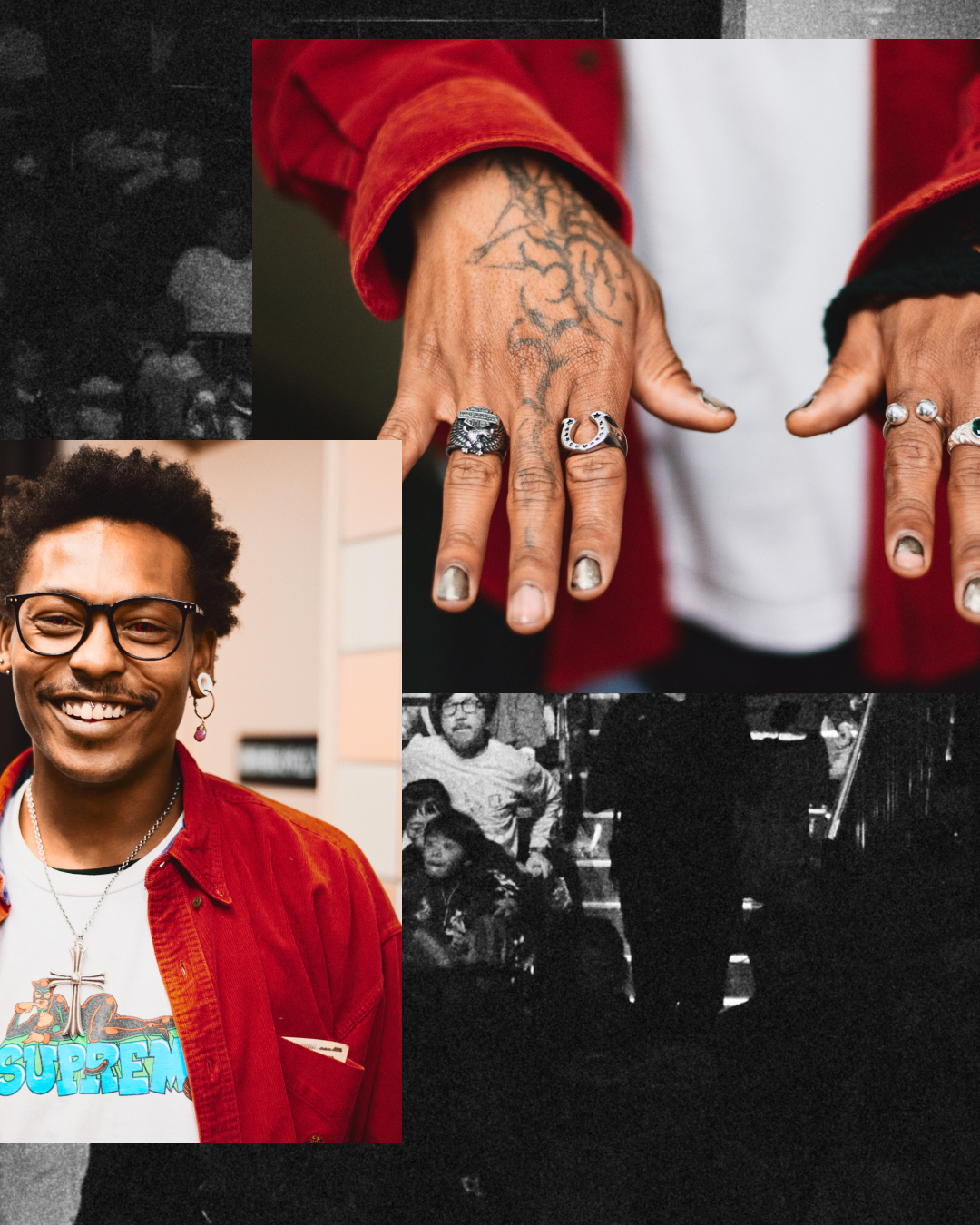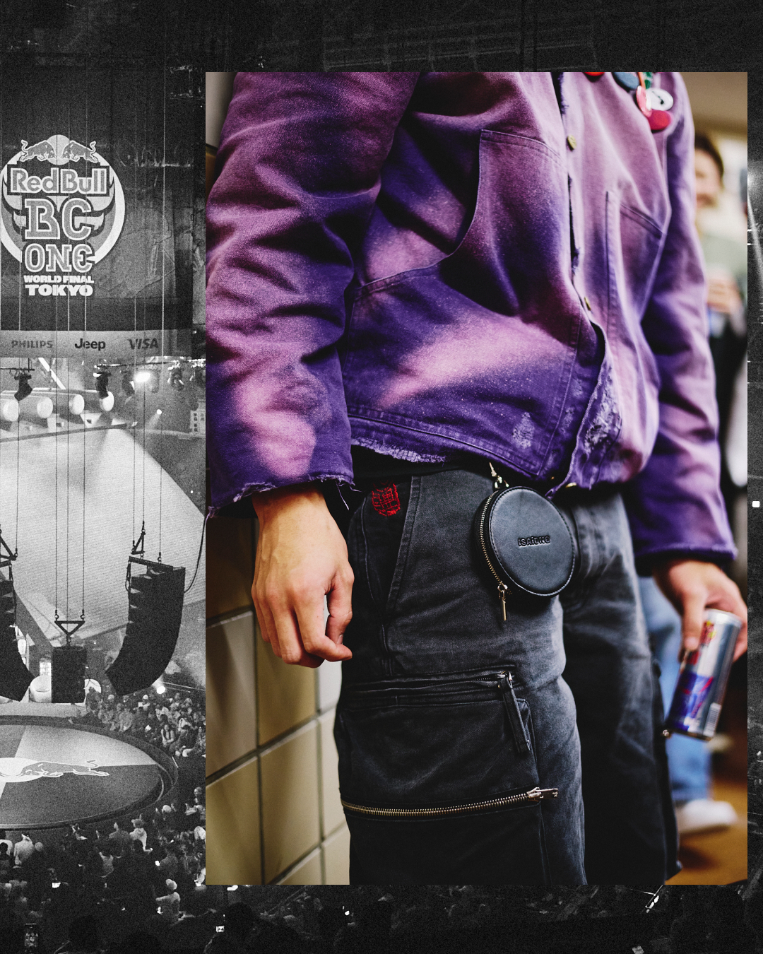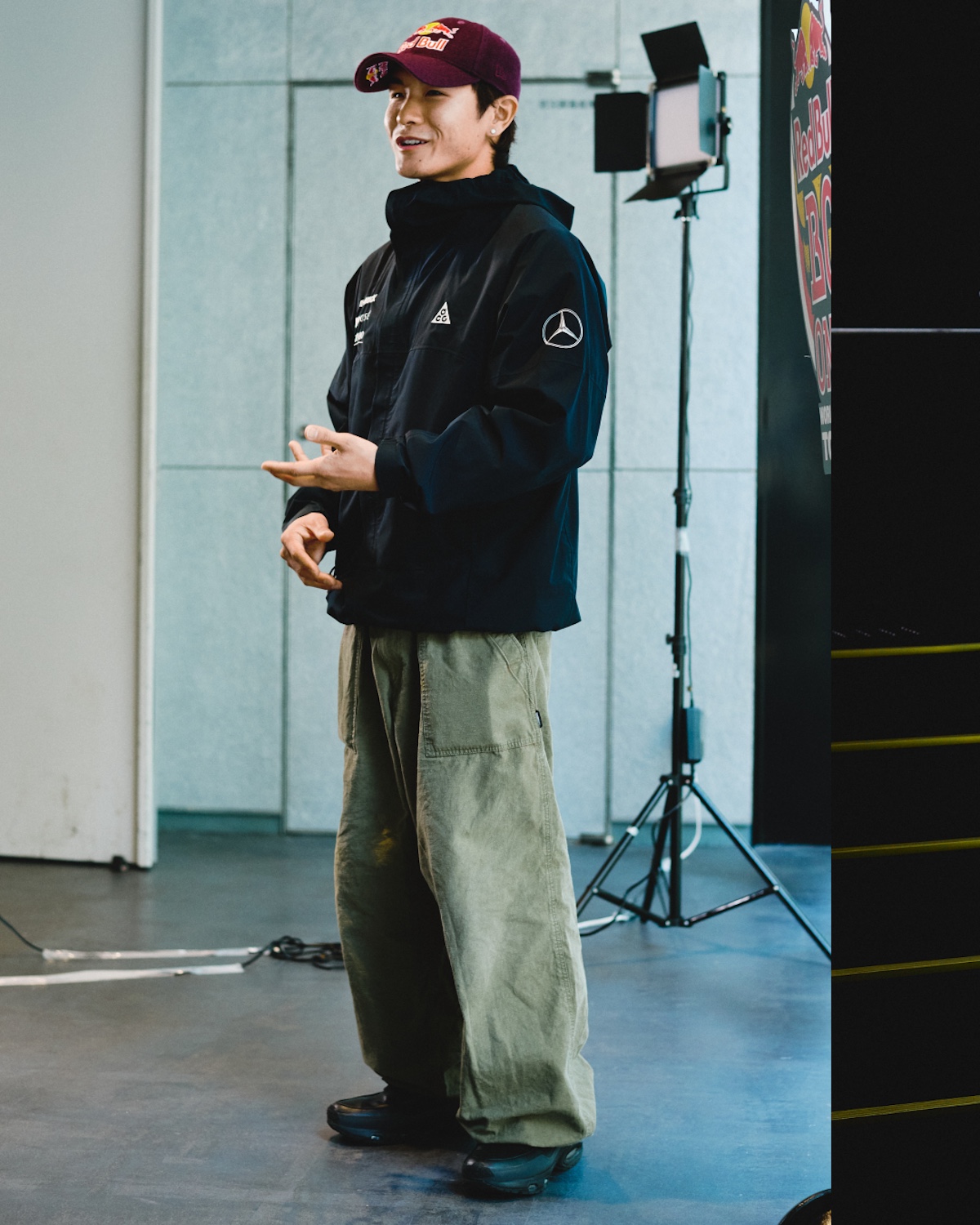 会場販売スタッフのTomさんは、背中にさまざまな種類のレッドブルを詰めたバックパックを背負い、フロアを軽快に巡回。動きやすさを優先した装いの中に、ワークパンツや小物使いでストリートの要素を自然にミックスし、自分らしいスタイルを作っている。