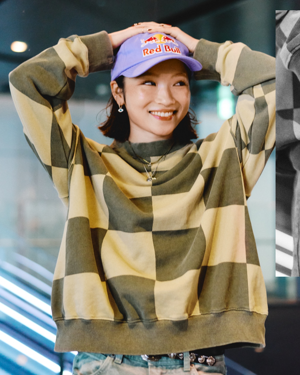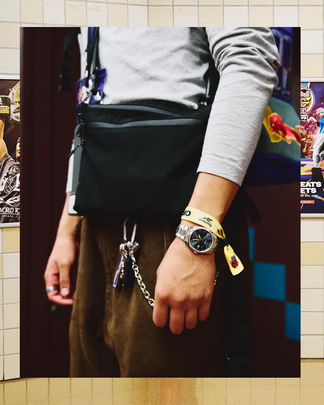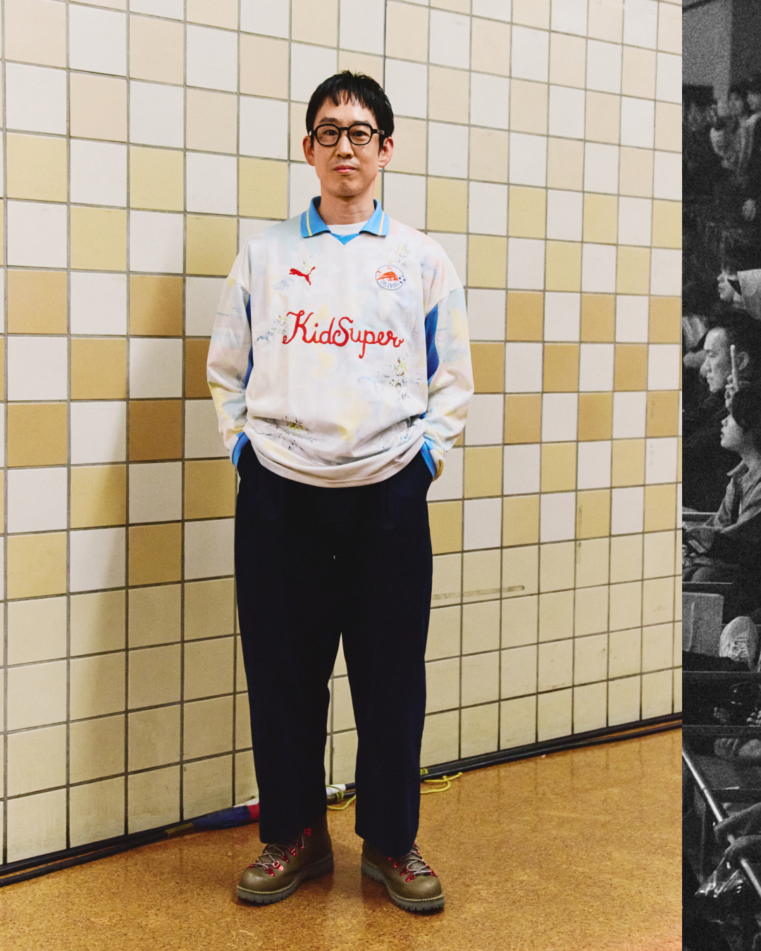 友人に誘われて来場したというフッキーさん。〈KIDSUPER〉×〈PUMA〉のユニフォームにを主役に、〈BuddyOptical〉の眼鏡を合わせた軽やかなスタイルで会場へ。「ブレイキンはあまり知らない世界だったけど、生で見ると本当に興奮しますね」と、初体験の熱気を満喫していた。