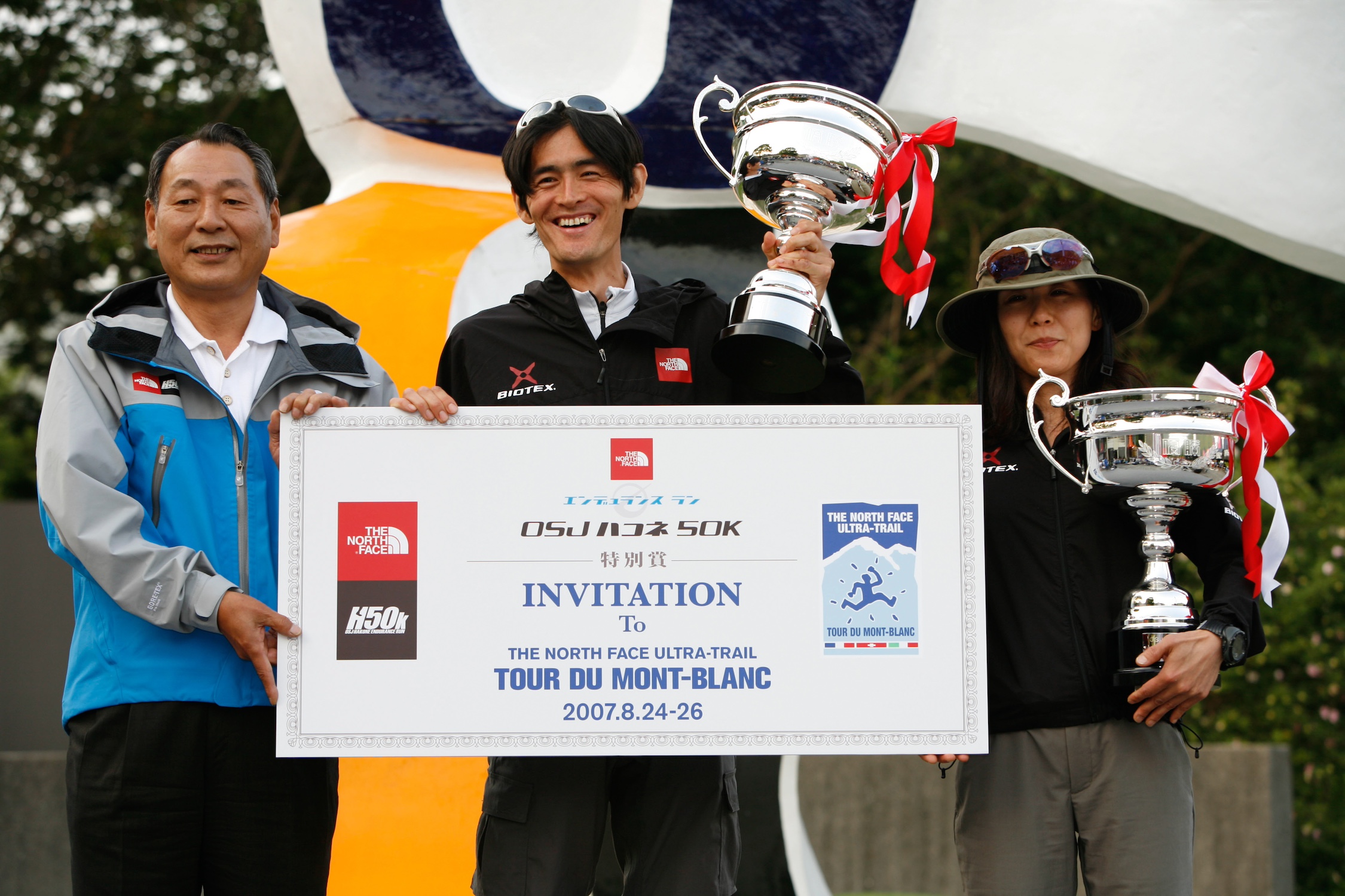 3) 当時〈ザ・ノース・フェイス〉(以後〈TNF〉)のプロモーション担当の三浦務さんが、「トレイルラニング」は新たなアウトドアの商材になるのではないか、と注目。新しい大会の開催を企画する。プロモーション効果を狙い、開催時期は4~5月、日本中の誰もが知っていて、首都圏から日帰り圏内で、と「ハコネ50K」がプランされる。優勝男女の副賞は2007年「UTMB」への出場&招待だ。