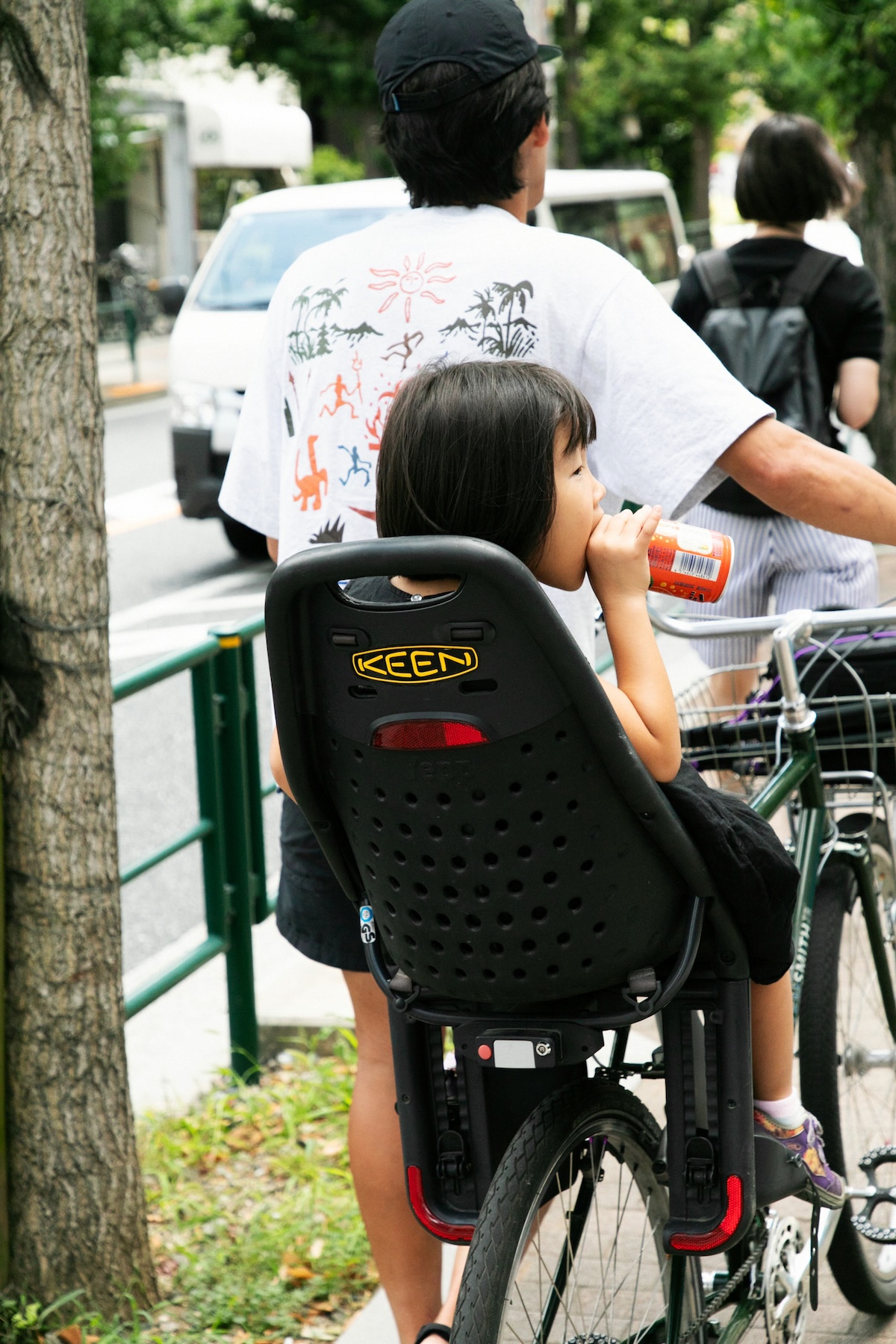 チャイルドシートは、かつて長女の特等席。いまは次女が座り、子どもの成長に合わせて役割を変えるのが、なかもと家の自転車。