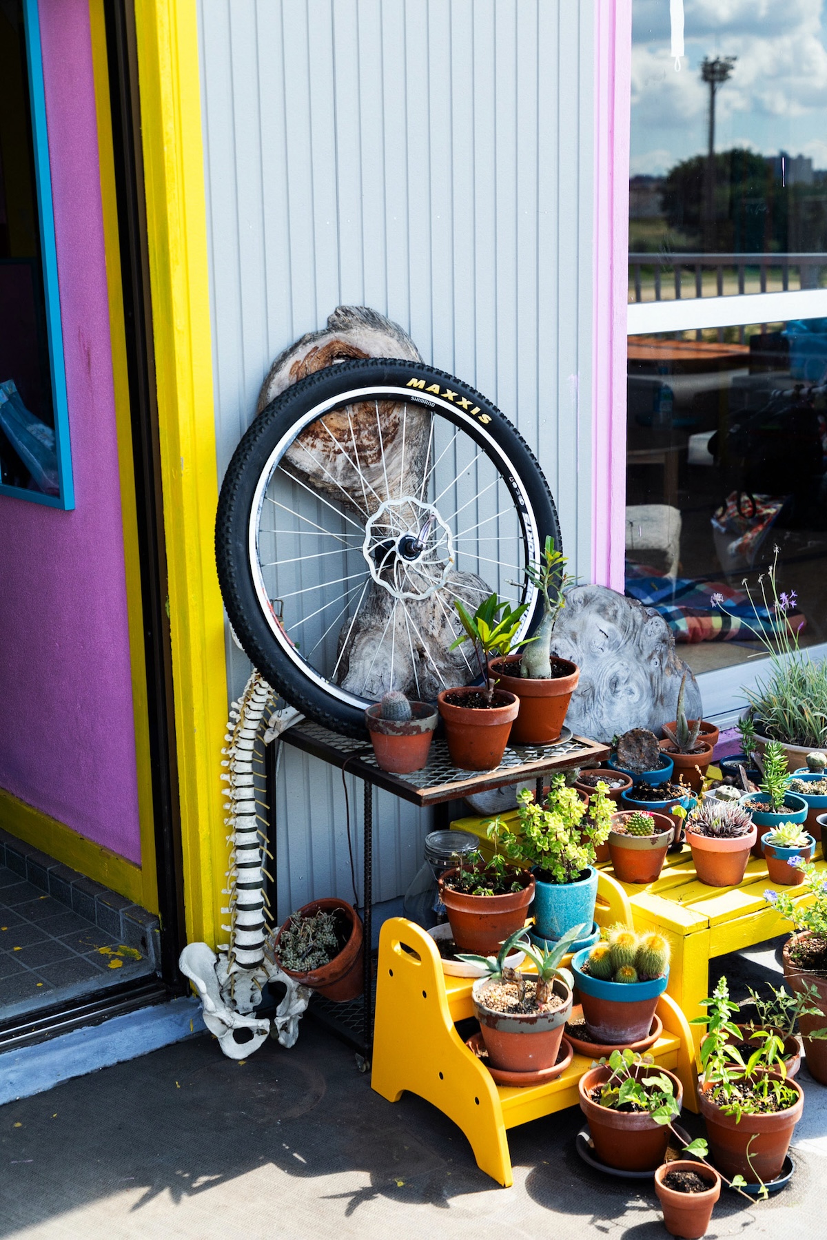 遊び心いっぱいのなかもと家では、自転車のタイヤさえオブジェのように楽しげに表情を変える。
