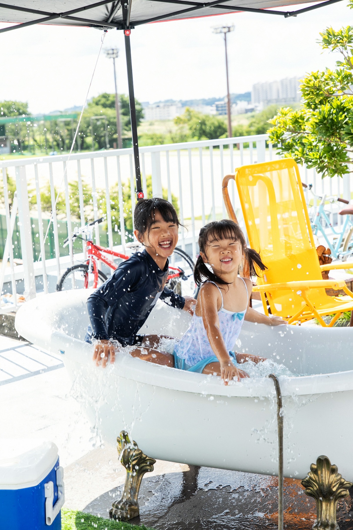 ルーフバルコニーには大きなバスタブがあり、お風呂にもプールにも大変身。子どもたちにとって、最高の遊び場になっている。