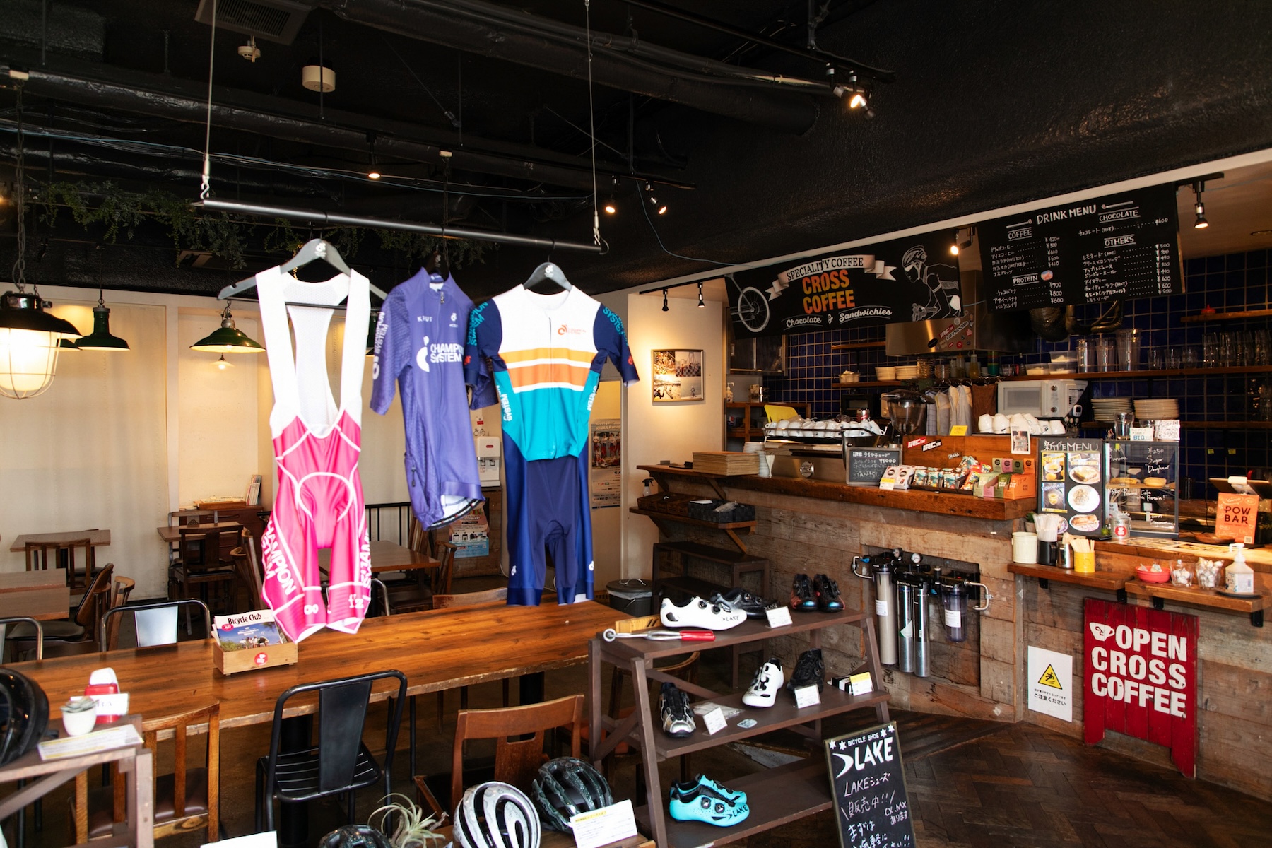 “サイクリストの聖地”とも呼ばれるほど、多くのローディが集まるこの街で、〈CROSS COFFEE〉はコミュニティハブとして親しまれている。隆太郎さんは接客や調理のほか、サイクルジャージやヘルメット、シューズの販売、ライドイベントの企画まで手がける。