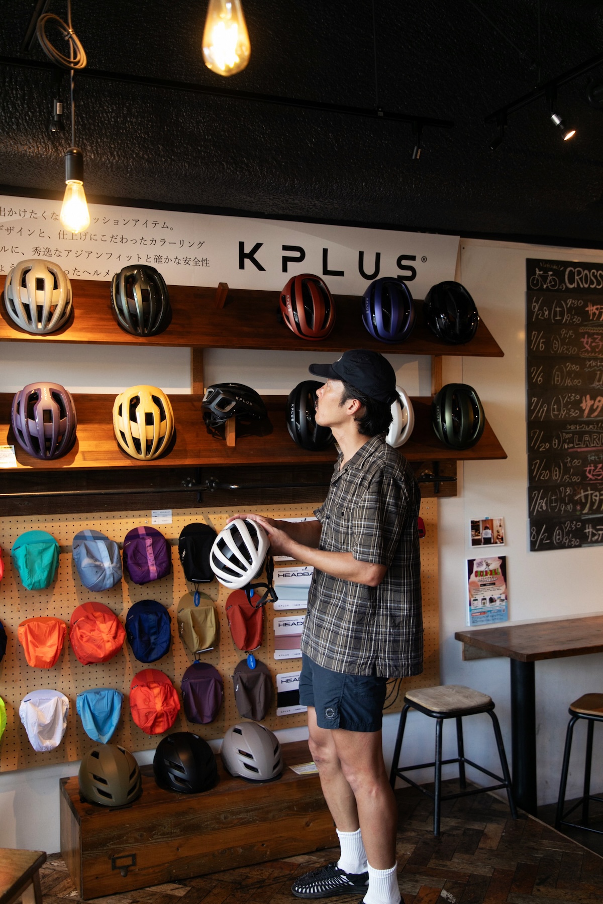 台湾ブランド〈KPLUS〉のヘルメットは、本格的なロードバイクにもカジュアルな街乗りにも対応。カラー豊富で人気が高く、デザインやフィット感は店頭で試せる。