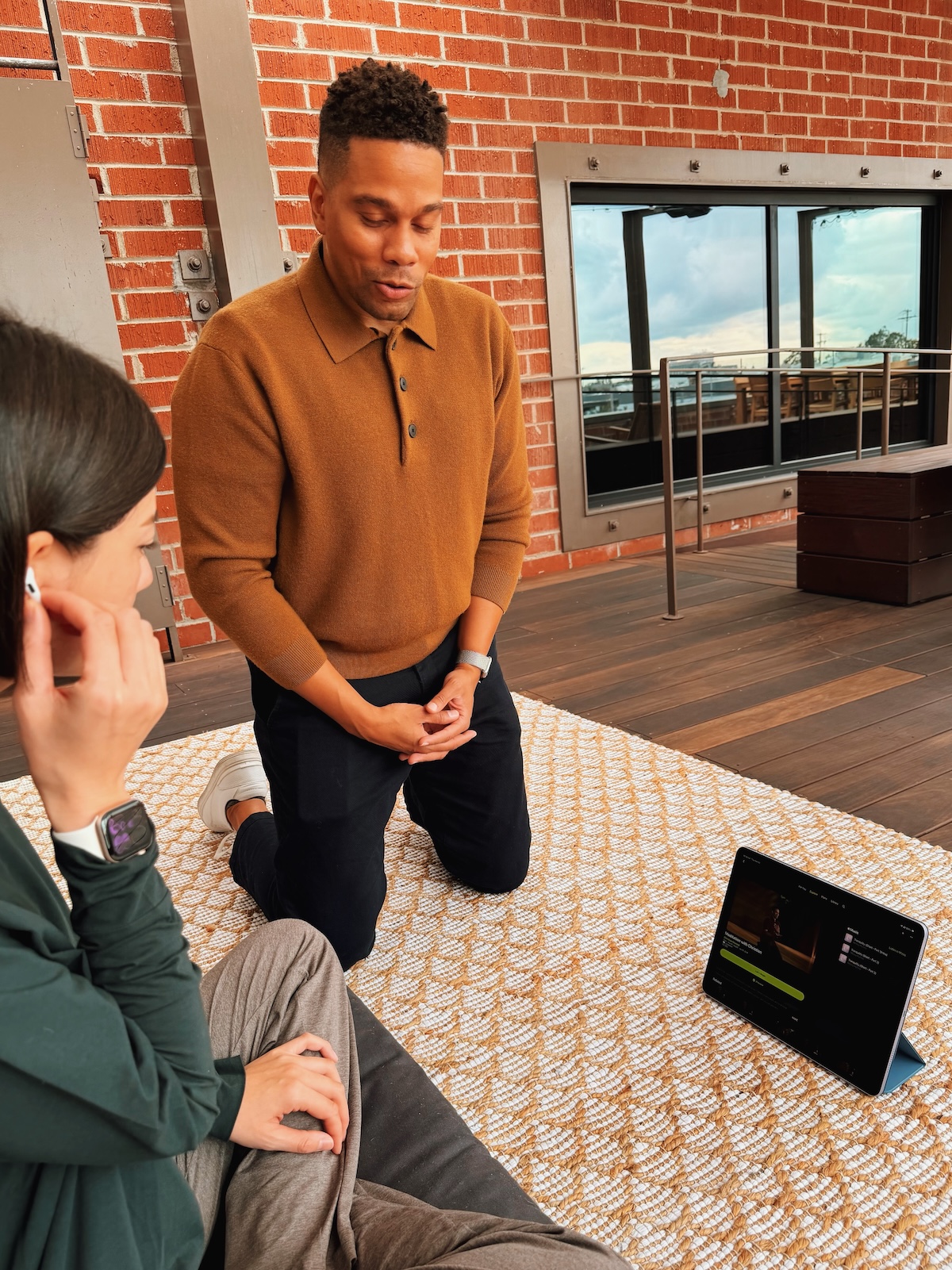 ヨガやメディテーションを担当するトレーナー、ジョネル・ルイスの撮影シーン。背景に映るプロップには造形物を使わず、レンガ、春材の床、植物などすべて本物にこだわっている。