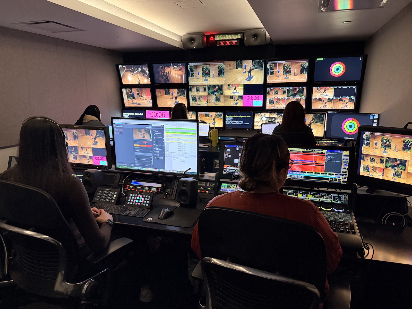2階には、照明や音響を調整するコントロールルームがある。撮影はライブ収録のため、生放送さながらの作業が行われている。