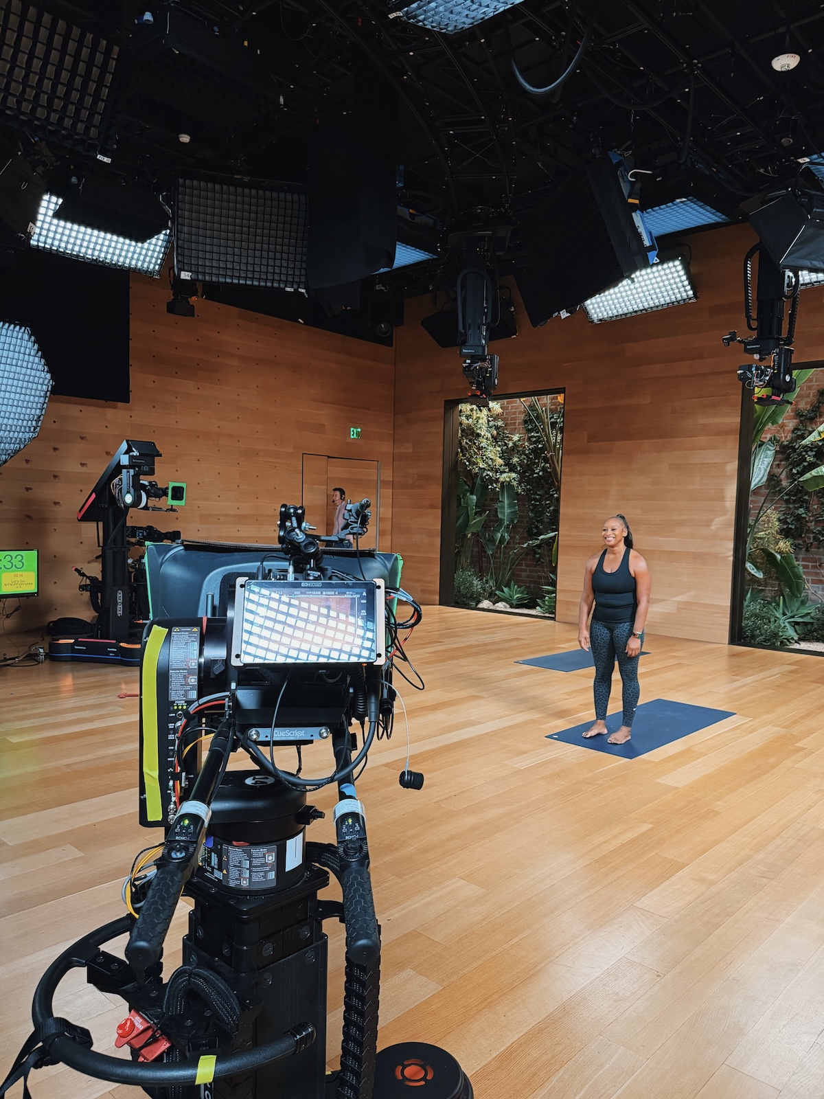 その理由は、このスタジオひとつで12種類のフィットネスが収録できるよう設計されているからだ。ヨガやピラティスに参加しても、背景にはダンス用のウォールや高強度インターバル用の設備が自然と目に入る。そのため映像は専門的すぎる印象にならず、誰もが気負わず参加できる、居心地のよい雰囲気に仕上がっている。