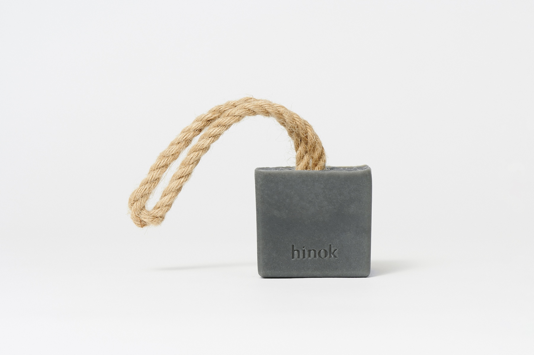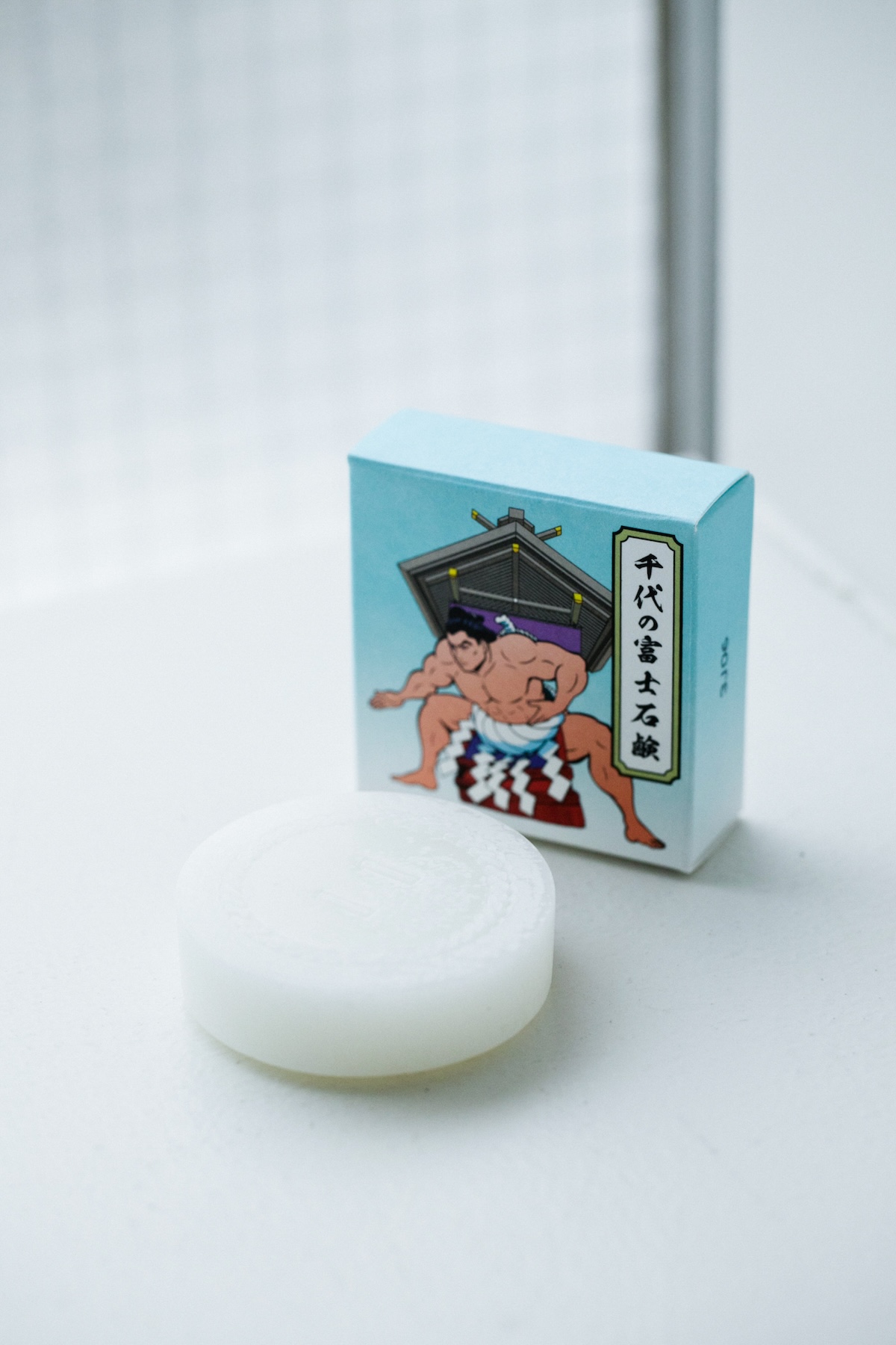 秋元さんがプロデュースした檜風呂をイメージした爽やかな香りの〈千代の富士石鹸〉。丸い石鹸を土俵に見立てて。